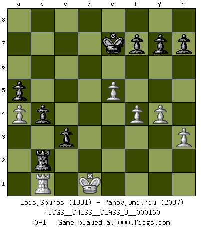 Last move : 0-1 2012 January 16 9:40:38 [Event "FICGS__CHESS__CLASS_B__000160"] [Site "FICGS"] [Date "2011.11.02"] [Round "1"] [White "Lois,Spyros"] [Black "Panov,Dmitriy"] [Result "0-1"] [WhiteElo "1891"] [BlackElo "2037"] 1.e4 e5 2.Nf3 Nc6 3.Bb5 a6 4.Ba4 Nf6 5.O-O Be7 6.Re1 d6 7.c3 O-O 8.d4 b5 9.Bc2 exd4 10.cxd4 Nb4 11.Bb3 c5 12.a3 Nc6 13.e5 dxe5 14.dxe5 Qxd1 15.Rxd1 Ne4 16.Re1 c4 17.Bc2 Nc5 18.Nc3 Rd8 19.Bg5 Bg4 20.Bxe7 Nxe7 21.Ng5 Bf5 22.Nge4 Nxe4 23.Bxe4 Bxe4 24.Rxe4 Rd2 25.Rb1 Rad8 26.R4e1 Kf8 27.h3 Nc6 28.f4 Nd4 29.Rf1 Ne2+ 30.Nxe2 Rxe2 31.Rf2 R8d2 32.Rxe2 Rxe2 33.Kh2 a5 34.a4 b4 35.Kg3 Re3+ 36.Kf2 Rb3 37.Ke2 Ke7 38.Kd1 c3 39.g4 Rxb2 0-1 Ruy Lopez : Closed, Averbach variation Kingside Castling by player White (move 5) Kingside Castling by player Black (move 7) Player Black won this chess game. Follow this game move after move (download)Fischer wanted to give the Russians a taste of their own medicine. (Larry Evans) Mit Schach schule ich mein Gefühl für Geometrie, was für Tennis und Schach gleichermaßen wichtig ist. (Boris Becker) Combinaciones deslumbrantes son para la mayoría, mover madera es para los pocos. (Georg Kieninger) Les échecs sont utiles à l'exercice de la faculté de penser et à celle de l'imagination. Car nous devons posséder une méthode élaborée pour atteindre des buts partout où nous devons conduire notre raison. (Leibnitz) History is a gallery of pictures in which there are few originals and many copies. (Alexis de Tocqueville)