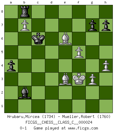 Last move : 0-1 2007 June 17 22:7:39 [Event "FICGS__CHESS__CLASS_C__000024"] [Site "FICGS"] [Date "2007.01.07"] [Round "1"] [White "Hrubaru,Mircea"] [Black "Mueller,Robert"] [Result "0-1"] [WhiteElo "1734"] [BlackElo "1760"] 1.e4 e6 2.d4 d5 3.Nd2 c5 4.Ngf3 Nf6 5.e5 Nfd7 6.c3 Nc6 7.Bd3 Be7 8.h4 Qb6 9.O-O cxd4 10.cxd4 Nxd4 11.Nxd4 Qxd4 12.Nf3 Qg4 13.g3 Nc5 14.Be2 Qb4 15.a3 Qa4 16.Be3 Qxd1 17.Rfxd1 Nb3 18.Rab1 Bd7 19.Nd2 Nxd2 20.Rxd2 f6 21.exf6 Bxf6 22.Rc1 O-O 23.Bg4 Rfe8 24.f4 a5 25.Rc5 Rec8 26.Rcxd5 exd5 27.Bxd7 Rc1+ 28.Kg2 d4 29.Rxd4 Rc2+ 30.Rd2 Rxb2 31.Be6+ Kf8 32.Rxb2 Bxb2 33.a4 Ke7 34.f5 Kd6 35.Kf3 b5 36.axb5 a4 37.b6 Kc6 38.b7 Rb8 0-1 French : Tarrasch, Open variation Kingside Castling by player White (move 9) Kingside Castling by player Black (move 22) Player Black won this chess game. Follow this game move after move (download)You know, comrade Pachman, I don't enjoy being a Minister, I would rather play Chess like you. (Che Guevara) Ja, ich habe einmal eine Blitzpartie gespielt, es war in einem Zug, 1929. --im Interview 1989 (Mikhail Moiseyevich Botvinik) El Ajedrez te enseña a controlarl la excitación inicial que sientes cuando vez algo que parece bueno y te enseña a pensar objetivamente cuando te encuentras en problemas. (Stanley Kubrick) Que feriez-vous si vous étiez en train de jouer aux échecs et que la fin du monde arrive ? Je continuerais à jouer. (Saint Borromée) The best teachers teach from the heart, not from the book. (Author unknown)