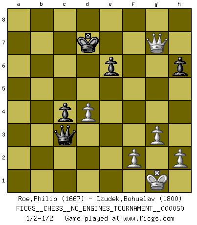 Last move : 1/2-1/2 2012 February 16 8:2:41 [Event "FICGS__CHESS__NO_ENGINES_TOURNAMENT__000050"] [Site "FICGS"] [Date "2011.11.04"] [Round "1"] [White "Roe,Philip"] [Black "Czudek,Bohuslav"] [Result "1/2-1/2"] [WhiteElo "1667"] [BlackElo "1800"] 1.e4 c6 2.d4 d5 3.exd5 cxd5 4.Bd3 Nc6 5.c3 Nf6 6.Bf4 Bg4 7.Nf3 Bxf3 8.Qxf3 e6 9.O-O Bd6 10.Bg5 Be7 11.Nd2 h6 12.Bh4 Ne4 13.Bxe7 Nxd2 14.Qf4 Qxe7 15.Qxd2 O-O-O 16.a4 Na5 17.Qe2 Qc7 18.b4 Nc4 19.Bxc4 dxc4 20.b5 Rd5 21.Rfb1 Kb8 22.a5 Rc8 23.b6 Qc6 24.bxa7+ Kxa7 25.Rb6 Rxa5 26.Rxb7+ Kxb7 27.Rxa5 Qb6 28.Qe4+ Kc7 29.Ra4 Qb3 30.Ra7+ Kd8 31.g3 Rc7 32.Rxc7 Kxc7 33.Qf4+ Kd8 34.Qxf7 Qxc3 35.Qf8+ Kd7 36.Qxg7+ Kd6 37.Qe5+ Kd7 38.Qg7+ Kd6 39.Qe5+ Kd7 40.Qg7+ 1/2-1/2 Caro-Kann : Exchange, Rubinstein variation Kingside Castling by player White (move 9) Queenside Castling by player Black (move 15) This chess game ended in a draw. Follow this game move after move (download)Chess is so inspiring that I do not believe a good player is capable of having an evil thought during the game. (Wilhelm Steinitz) Intelligenz läßt sich nicht am Weg, sondern nur am Ergebnis feststellen. (Garry Kasparov) EL Ajedrez es como la vida. (Boris Spassky) Si rien de grave n'est détecté lors de l'analyse d'une position, on joue alors le coup. Seconde règle de Blumenfeld. Convictions are more dangerous enemies of truth than lies. (Friedrich Nietzsche)