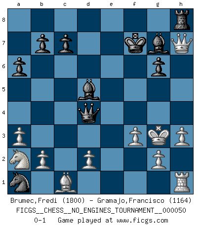 Last move : 0-1 2011 November 13 0:36:1 [Event "FICGS__CHESS__NO_ENGINES_TOURNAMENT__000050"] [Site "FICGS"] [Date "2011.11.04"] [Round "1"] [White "Brumec,Fredi"] [Black "Gramajo,Francisco"] [Result "0-1"] [WhiteElo "1800"] [BlackElo "1164"] 1.e4 Nc6 2.Nf3 e5 3.a3 Nf6 4.Nc3 a6 5.Bc4 Nxe4 6.Bxf7+ Kxf7 7.Nxe4 d5 8.Nc3 e4 9.Ng1 Bf5 10.Nge2 d4 11.Na2 d3 12.Ng3 Nd4 13.cxd3 Be6 14.Nxe4 Bb3 15.Qh5+ g6 16.Qe5 Nc2+ 17.Kf1 Nxa1 18.Qxh8 Qxd3+ 19.Kg1 Qxe4 20.Qxh7+ Bg7 21.h3 Bd5 22.f3 Qd4+ 23.Kh2 Qf4+ 24.Kg1 Re8 25.Kf2 Qd4+ 26.Kg3 Rh8 0-1 KP : Nimzovich defense Player Black won this chess game. Follow this game move after move (download)The older I grow, the more I value Pawns. (Keres) Schach ist mein Leben, meine Leidenschaft, was ich gelernt habe und seit meinem 14. Lebensjahr profimässig praktiziere. Darauf zu verzichten, würde mir sehr schwer fallen. (Viktor Kortschnoi) Vive, pierde y aprende al observar a tu oponente como ganar. (Amber Steenbock) A ce moment-là, je menaçais de comprendre la position ! (Clément L'Heureux) Whoever said the pen is mightier than the sword obviously never encountered automatic weapons. (US General Douglas MacArthur)