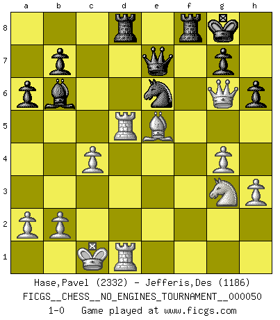 Last move : 1-0 2011 December 22 19:21:11 [Event "FICGS__CHESS__NO_ENGINES_TOURNAMENT__000050"] [Site "FICGS"] [Date "2011.11.04"] [Round "1"] [White "Hase,Pavel"] [Black "Jefferis,Des"] [Result "1-0"] [WhiteElo "2332"] [BlackElo "1186"] 1.e4 e5 2.f4 Bc5 3.Nf3 exf4 4.d4 Bb6 5.Bxf4 Nf6 6.Nc3 O-O 7.Qd2 d6 8.O-O-O Bg4 9.h3 Bh5 10.g4 Bg6 11.Bd3 a6 12.Bg5 h6 13.Bh4 Nbd7 14.Ne2 Qc8 15.e5 Nd5 16.Bg3 dxe5 17.Bxg6 fxg6 18.Nxe5 Nxe5 19.Bxe5 c6 20.c4 Nc7 21.Qd3 Ne6 22.Qxg6 Qd7 23.d5 cxd5 24.Rxd5 Qe7 25.Rhd1 Rad8 26.Ng3 1-0 KGD : Classical variation Kingside Castling by player Black (move 6) Queenside Castling by player White (move 8) Player White won this chess game. Follow this game move after move (download)I played Chess with him and would have beaten him sometimes only he always took back his last move, and ran the game out differently. (Mark Twain) Das Schachspiel übertrifft alle anderen Spiele so weit wie der Chimborasso einen Misthaufen. (Arthur Schopenhauer) No es suficiente ser un buen jugador, se debe también de jugar bién. (Siegbert Tarrasch) Celui qui prend des risques peut perdre, celui qui n'en prend pas perd toujours. (Xavier Tartacover) However beautiful the strategy, you should occasionally look at the results. (Winston Churchill)