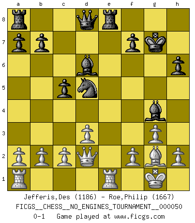 Last move : 0-1 2011 December 14 20:18:14 [Event "FICGS__CHESS__NO_ENGINES_TOURNAMENT__000050"] [Site "FICGS"] [Date "2011.11.04"] [Round "1"] [White "Jefferis,Des"] [Black "Roe,Philip"] [Result "0-1"] [WhiteElo "1186"] [BlackElo "1667"] 1.e4 c5 2.d3 e6 3.Nf3 d5 4.exd5 exd5 5.g3 Nf6 6.Bg2 Be7 7.O-O O-O 8.Re1 Nc6 9.Nc3 Bf5 10.Ne5 Nxe5 11.Rxe5 Be6 12.Bg5 h6 13.Bxh6 gxh6 14.Qf3 Bd6 15.R5e1 Bg4 16.Qe3 Kg7 17.Nxd5 Re8 18.Qd2 Nxd5 0-1 Sicilian defense Kingside Castling by player White (move 7) Kingside Castling by player Black (move 7) Player Black won this chess game. Follow this game move after move (download)Chess is really ninety nine percent calculation. (Soltis) Gott hat gewollt, dass ich Champion werde. (Surab Azmajparaschvili) Botvinnik trataba de restarle el misterio al Ajedrez, siempre relacionandolo a situaciones de la vida ordinaria. El gustaba de llamar al Ajedrez un típico problema inexacto similar a aquellos de los cuales la gente siempre tiene que enfrentarse en la vida cotidiana. (Garry Kasparov) L'ordinateur a tué l'originalité. Il n'y a plus guère d'aventures sur l'échiquier. (Jacob Murray) Either move or be moved. (Ezra Pound)