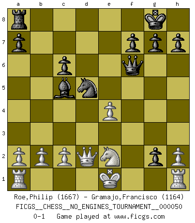 Last move : 0-1 2011 November 14 14:41:32 [Event "FICGS__CHESS__NO_ENGINES_TOURNAMENT__000050"] [Site "FICGS"] [Date "2011.11.04"] [Round "1"] [White "Roe,Philip"] [Black "Gramajo,Francisco"] [Result "0-1"] [WhiteElo "1667"] [BlackElo "1164"] 1.e4 Nc6 2.d4 d5 3.Nc3 dxe4 4.d5 Ne5 5.Qd4 Ng6 6.Bb5+ Bd7 7.Bc4 e5 8.Qxe4 Nf6 9.Qe2 Bb4 10.Bd2 O-O 11.f3 Nf4 12.Bxf4 exf4 13.Qd2 Re8+ 14.Nge2 Bc5 15.Kf1 b5 16.Nxb5 Bxb5 17.Bxb5 Nxd5 18.g3 c6 19.Bd3 Qf6 20.Be4 Rxe4 21.fxe4 fxg3 22.Ke1 g2 0-1 KP : Nimzovich defense, Bogolyubov variation Kingside Castling by player Black (move 10) Player Black won this chess game. Follow this game move after move (download)Every Pawn is a potential Queen. (James Mason) Der Traum, für den ich lebe, ist der von einem freien Russland. Viele mögen sagen: Russland hat doch ein Parlament, einen gewählten Präsidenten. Aber ich spüre, dass in meiner Heimat die Angst wiederkehrt. Eine Angst, sich frei zu äußern, bestimmte Dinge zu tun (Garry Kasparov) Con el fin de mejorar tu juego, debes de estudiar los finales antes que todo, ya que mientras que los finales pueden ser estudiados y dominados por sí mismos, el juegomedio y la apertura deben de ser estudiados en relación con los finales. (José Raúl Capablanca) 'L'échange des dames est un coup dur pour les deux adversaires...' Un journaliste lors d'une partie du match Spassky-Fischer The obstacle is the path. (Zen proverb)