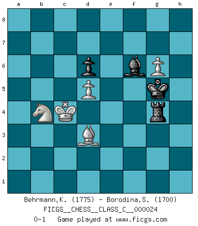 Last move : 0-1 2007 July 28 1:58:30 [Event "FICGS__CHESS__CLASS_C__000024"] [Site "FICGS"] [Date "2007.01.07"] [Round "1"] [White "Behrmann,Klaus"] [Black "Borodina,Svetlana"] [Result "0-1"] [WhiteElo "1775"] [BlackElo "1700"] 1.e4 c5 2.Nf3 Nc6 3.d4 cxd4 4.Nxd4 Nf6 5.Nc3 e5 6.Ndb5 d6 7.Bg5 a6 8.Na3 b5 9.Bxf6 gxf6 10.Nd5 f5 11.Bd3 Be6 12.O-O Bxd5 13.exd5 Ne7 14.Nxb5 Bg7 15.Nc3 e4 16.Bc4 Ng6 17.Rb1 Qg5 18.Re1 Nh4 19.g3 Be5 20.Re3 h5 21.Bb3 Kf8 22.Bc4 Nf3+ 23.Rxf3 exf3 24.Qxf3 h4 25.Ne2 hxg3 26.fxg3 Rh4 27.Bd3 f4 28.Rf1 Kg7 29.Rf2 Rf8 30.c3 fxg3 31.hxg3 f5 32.Bxf5 Rh6 33.Qg4 Qxg4 34.Bxg4 Rfh8 35.Bf3 Rh3 36.g4 a5 37.Kf1 a4 38.b4 axb3 39.axb3 Ra8 40.Ke1 Rf8 41.Bg2 Bxc3+ 42.Kf1 Rd3 43.Rxf8 Kxf8 44.Be4 Re3 45.Bc2 Ba5 46.Nd4 Re5 47.b4 Bxb4 48.Nc6 Re1+ 49.Kf2 Bd2 50.Bf5 Bc3 51.g5 Kg7 52.Bc2 Ra1 53.Ke3 Ra8 54.Bd3 Rf8 55.g6 Re8+ 56.Kf4 Kf6 57.Be4 Bd2+ 58.Kf3 Rf8 59.Ke2 Bh6 60.Kd3 Rh8 61.Kc4 Bg7 62.Bd3 Rh4+ 63.Kb3 Rh3 64.Kc4 Rg3 65.Kd4 Kg5 66.Kc4 Bf6 67.Nb4 Rg4+ 0-1 Sicilian : Pelikan (Lasker/Sveshnikov) variation Kingside Castling by player White (move 12) 10 pieces endgame at move 43 : White KBNPPP , Black KRBP WHITE : King + 1 Bishop 1 Knight 3 Pawns BLACK : King + 1 Rook 1 Bishop 1 Pawn 9 pieces endgame at move 47 : White KBNPP , Black KRBP WHITE : King + 1 Bishop 1 Knight 2 Pawns BLACK : King + 1 Rook 1 Bishop 1 Pawn Player Black won this chess game. Follow this game move after move (download)Fischer wanted to give the Russians a taste of their own medicine. (Larry Evans) Ich verachte die Medien. (Robert James Fischer) Morphy probablemente fue el genio más grande de todos. (Bobby Fischer) La guerre est enfant de la passion, la passion est enfant du narcissisme et le narcissisme est l'enfant. (...) Une autre partie ? (Thibault de Vassal) Man with more than one clock never knows what time it is. (Chinese thought)
