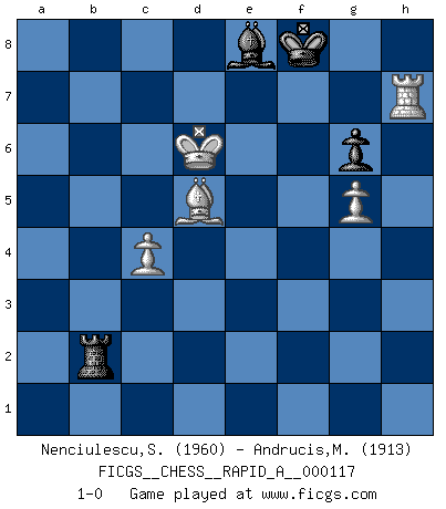 Last move : 1-0 2012 January 12 10:15:27 [Event "FICGS__CHESS__RAPID_A__000117"] [Site "FICGS"] [Date "2011.11.04"] [Round "1"] [White "Nenciulescu,Silviu"] [Black "Andrucis,Maris"] [Result "1-0"] [WhiteElo "1960"] [BlackElo "1913"] 1.d4 Nf6 2.c4 g6 3.Nc3 d5 4.cxd5 Nxd5 5.e4 Nxc3 6.bxc3 Bg7 7.Nf3 c5 8.Rb1 O-O 9.Be2 Nc6 10.d5 Ne5 11.Nxe5 Bxe5 12.Qd2 Qa5 13.Rb3 Qa4 14.c4 e6 15.O-O exd5 16.exd5 Bd4 17.Ra3 Qb4 18.Qxb4 cxb4 19.Rd3 Bc3 20.Be3 b6 21.Rc1 Re8 22.h4 Bd7 23.Rdxc3 bxc3 24.Rxc3 Rac8 25.Ra3 Rc7 26.f3 f6 27.Kf2 Kg7 28.g4 Rb7 29.Bd4 Kf7 30.g5 fxg5 31.hxg5 Bf5 32.Bf1 Rc8 33.Be5 Re8 34.f4 Rc8 35.Be2 Rd7 36.Ke3 Rc5 37.Kd4 Ke8 38.Bd1 Kf7 39.Ba4 Ra5 40.Kc3 Re7 41.Kb4 Bg4 42.Rd3 Bd7 43.Bb3 Ke8 44.Re3 Kf7 45.Re2 Rc5 46.d6 Re6 47.Rh2 Kg8 48.a4 a5+ 49.Kc3 Re8 50.Bd4 Re4 51.Bc2 Rxf4 52.Bxc5 bxc5 53.Re2 Rd4 54.Re5 Rxd6 55.Rxc5 Ra6 56.Rc7 Be8 57.Re7 Kf8 58.Rxh7 Re6 59.Kd4 Rd6+ 60.Ke5 Rd2 61.Be4 Re2 62.Kd4 Rd2+ 63.Ke3 Rd1 64.Ra7 Re1+ 65.Kd4 Rd1+ 66.Kc5 Bxa4 67.Rxa5 Be8 68.Ra8 Ke7 69.Bd5 Rb1 70.Ra7+ Kf8 71.Rh7 Rb2 72.Kd6 1-0 King's Indian defense, 3.Nc3 Kingside Castling by player Black (move 8) Kingside Castling by player White (move 15) 10 pieces endgame at move 66 : White KRBPP , Black KRBPP WHITE : King + 1 Rook 1 Bishop 2 Pawns BLACK : King + 1 Rook 1 Bishop 2 Pawns 9 pieces endgame at move 67 : White KRBPP , Black KRBP WHITE : King + 1 Rook 1 Bishop 2 Pawns BLACK : King + 1 Rook 1 Bishop 1 Pawn Player White won this chess game. Follow this game move after move (download)Man is a frivolous, a specious creature, and like a Chess player, cares more for the process of attaining his goal than for the goal itself. (Dostoyevsky) Fischer ist das größte Genie, das je vom Schachhimmel heruntergestiegen ist. (Mikhail Nekhemyevich Tal) Juega la Apertura como un libro, el Juego Medio como un mago y los Finales como una máquina. (Spielmann) Je crois qu'il existe des manières très spécifiques de jouer efficacement contre une machine. Evidemment, nous n'avons aucune chance en technique pure, parce que l'ordinateur calcule de manière parfaite. Mais lorsque nous faisons appel à notre cerveau, en utilisant l'intuition et la compréhension, alors nous restons beaucoup plus forts. (Anatoli Karpov) All the troubles of the world come from being unable to sit alone in a quiet room. (Blaise Pascal)