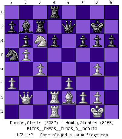Last move : 1/2-1/2 2012 April 5 7:40:15 [Event "FICGS__CHESS__CLASS_A__000110"] [Site "FICGS"] [Date "2011.11.04"] [Round "1"] [White "Duenas,Alexis"] [Black "Hamby,Stephen"] [Result "1/2-1/2"] [WhiteElo "2037"] [BlackElo "2163"] 1.d4 Nf6 2.c4 e6 3.Nc3 Bb4 4.Qc2 c5 5.dxc5 O-O 6.a3 Bxc5 7.Nf3 b6 8.Bf4 Bb7 9.Rd1 Nc6 10.e3 Nh5 11.Bg3 Be7 12.Be2 Nxg3 13.hxg3 h6 14.O-O d6 15.Rd2 Qb8 16.Rfd1 Rd8 17.g4 Qc7 18.Nd5 Qd7 19.Nxe7+ Qxe7 20.b4 Rac8 21.Qb3 g6 22.Qb2 Rc7 23.Qb1 Kg7 24.Qb2+ e5 25.b5 Na5 26.Nxe5 f6 27.Nc6 1/2-1/2 Nimzo-Indian : Classical, Pirc variation Kingside Castling by player Black (move 5) Kingside Castling by player White (move 14) This chess game ended in a draw. Follow this game move after move (download)It is always better to sacrifice your opponent's men. (Savielly Tartakower) Er war ein guter Schachspieler, aber ich kann Leute nicht ausstehen, die 'Heil Hitler' rufen (Über Alexander Aljechin). (Miguel Najdorf) El Ajedrez es el juego mas altamente simbólico, pero las agresiones estan por lo tanto aún mas francamente representadas en la partida. Tal vez comenzo como un juego de guerra; Algo como la representación de una batalla en miniatura entre las fuerzas de dos reinos. (Karl Meninger) Vous savez, camarade Pachman, je n'éprouve pas de plaisir à être ministre, je jouerais plutôt aux échecs comme vous, ou alors ferais une révolution au Venezuela. (Che Guevara à Ludek Pachman, 'Checkmate in Prague', 1975) That's absurd. I love it. (Gregory House, House M.D.)
