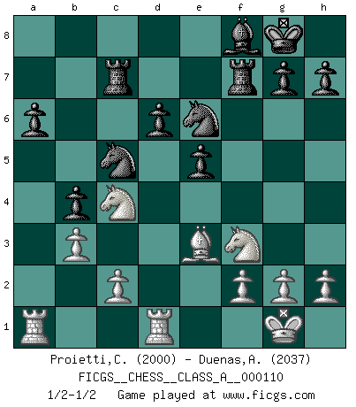 Last move : 1/2-1/2 2011 November 8 22:7:36 [Event "FICGS__CHESS__CLASS_A__000110"] [Site "FICGS"] [Date "2011.11.04"] [Round "1"] [White "Proietti,Costantino"] [Black "Duenas,Alexis"] [Result "1/2-1/2"] [WhiteElo "2000"] [BlackElo "2037"] 1.e4 e5 2.Nf3 Nc6 3.Bb5 a6 4.Ba4 Nf6 5.O-O Be7 6.Re1 b5 7.Bb3 d6 8.d3 O-O 9.a4 Be6 10.Bxe6 fxe6 11.Nbd2 b4 12.Nb3 Nd7 13.d4 Qe8 14.d5 Nd8 15.Na5 Nc5 16.Qe2 exd5 17.exd5 Nxa4 18.Qc4 Qb5 19.Qxc7 Rf7 20.Nc4 Qxd5 21.Ne3 Qb5 22.Qc4 Qxc4 23.Nxc4 Rc8 24.b3 Nc5 25.Bg5 Bf8 26.Be3 Nde6 27.Red1 Rc6 28.Na5 R6c7 29.Nc4 1/2-1/2 Ruy Lopez : Closed Kingside Castling by player White (move 5) Kingside Castling by player Black (move 8) This chess game ended in a draw. Follow this game move after move (download)Pawn endings are to Chess what putting is to golf. (Cecil Purdy) Am wohlsten fühle ich mich, wenn ich sehe, wie sich mein Gegner im Todeskampf windet. (Robert James Fischer) Aunque la mayoría de la gente disfruta observar las partidas de los grandes Maestros de ataque, algunos de los jugadores mas notables en la historia han sido los jugadores silenciosos posicionales. Lentamente ellos te aplastan despojandote de tu espacio, congestionando tus piezas y dejandote virtualmente sin nada que hacer. (Yasser Seirawan) Mais l'homme est une créature légère et illogique : semblable au joueur d'échecs, il n'aime que le processus du but à atteindre, non le but lui-même. (Dostoïevsky) Nobody is always a winner, and anybody who says he is, is either a liar or doesn't play poker. (Amarillo Slim)
