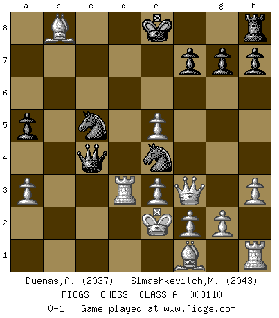 Last move : 0-1 2011 November 30 18:26:45 [Event "FICGS__CHESS__CLASS_A__000110"] [Site "FICGS"] [Date "2011.11.04"] [Round "1"] [White "Duenas,Alexis"] [Black "Simashkevitch,Mykola"] [Result "0-1"] [WhiteElo "2037"] [BlackElo "2043"] 1.d4 d5 2.c4 c6 3.e3 Nf6 4.Nc3 a6 5.Nf3 b5 6.b3 Bg4 7.h3 Bxf3 8.Qxf3 e5 9.dxe5 Bb4 10.Bd2 Bxc3 11.Bxc3 Ne4 12.Bb4 bxc4 13.bxc4 Qb6 14.a3 a5 15.cxd5 cxd5 16.Bd6 Qb2 17.Rd1 Qc3+ 18.Ke2 Nd7 19.Rxd5 Qc4+ 20.Rd3 Rb8 21.Bxb8 Ndc5 0-1 QGD Slav defense Player Black won this chess game. Follow this game move after move (download)A passed Pawn increases in strength as the number of pieces on the board diminishes. (Capablanca) Jeder Schachmeister war einmal ein Anfänger. (Irving Chernev) Una de estas pequeñas movidas modestas pudieran ser mas molestas a tu oponente que la amenaza mas grande. (Siegbert Tarrasch) Aucun coup ne doit être joué sans but. (Pedro Damiano) The beginning is the most important part of the work. (Plato)