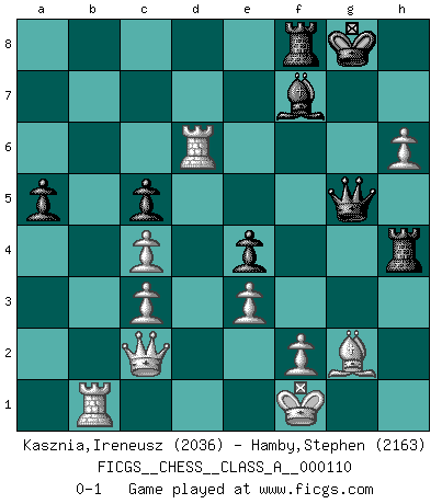 Last move : 0-1 2012 September 21 18:48:27 [Event "FICGS__CHESS__CLASS_A__000110"] [Site "FICGS"] [Date "2011.11.04"] [Round "1"] [White "Kasznia,Ireneusz"] [Black "Hamby,Stephen"] [Result "0-1"] [WhiteElo "2036"] [BlackElo "2163"] 1.c4 e5 2.Nc3 Nf6 3.Nf3 Nc6 4.g3 Bb4 5.Bg2 O-O 6.O-O e4 7.Ne1 Bxc3 8.dxc3 h6 9.Nc2 Re8 10.Ne3 d6 11.Qc2 a5 12.Rd1 b6 13.b3 Nb8 14.Nd5 Bb7 15.Bf4 Nbd7 16.a4 Nf8 17.h3 Ng6 18.Be3 c5 19.Kh2 Re5 20.Nxf6+ Qxf6 21.Rab1 Rd8 22.b4 Qe7 23.Qa2 Bc6 24.Kg1 Qc7 25.h4 f5 26.h5 f4 27.Bxf4 Nxf4 28.gxf4 Rxh5 29.e3 g5 30.Qe2 Rh4 31.fxg5 Rf8 32.bxa5 bxa5 33.Kf1 Bxa4 34.Rd2 Qd8 35.gxh6 Be8 36.Qd1 Bh5 37.Qc2 Qg5 38.Rxd6 Bf7 0-1 English Opening Kingside Castling by player Black (move 5) Kingside Castling by player White (move 6) Player Black won this chess game. Follow this game move after move (download)I won't play with you anymore. You have insulted my friend. - When an opponent cursed himself for a blunder. (Miguel Najdorf) Ja, ich habe einmal eine Blitzpartie gespielt, es war in einem Zug, 1929. --im Interview 1989 (Mikhail Moiseyevich Botvinik) El Ajedrez moderno está demasiado preocupado con cosas como la estructura de Peones. Olvidenlo, el Jaque Mate termina la partida. (Nigel Short) Vous m'avez demandé de vous exposer quel est le fondement de la prière. Je ne fais que préparer les pièces du jeu sur la table... Nous sera-t-il permis d'en adopter les règles et si nous les appliquons scrupuleusement nous ne tarderons pas à faire mat le Roi divin ! Il ne pourra échapper à nos mains. (Sainte Thérèse d'Avila, Chemin de perfection) Do not put your faith in what statistics say until you have carefully considered what they do not say. (William W. Watt)