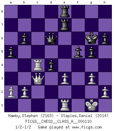 Last move : 1/2-1/2 2012 October 16 0:8:10 [Event "FICGS__CHESS__CLASS_A__000110"] [Site "FICGS"] [Date "2011.11.04"] [Round "1"] [White "Hamby,Stephen"] [Black "Staples,Daniel"] [Result "1/2-1/2"] [WhiteElo "2163"] [BlackElo "2014"] 1.Nf3 Nf6 2.c4 c5 3.g3 g6 4.Nc3 Bg7 5.Bg2 O-O 6.O-O d5 7.cxd5 Nxd5 8.Ng5 e6 9.d3 Nc6 10.Nge4 b6 11.Bg5 f6 12.Bd2 Bb7 13.Nxd5 exd5 14.Nc3 d4 15.Nb5 Kh8 16.Bf4 g5 17.Bd2 Qd7 18.Rc1 Rfe8 19.Re1 Re7 20.Qb3 Ne5 21.Bxb7 Qxb7 22.Nd6 Qd7 23.Nc4 h6 24.Qd1 Nxc4 25.Rxc4 a5 26.Qb3 Qd6 27.e4 dxe3 28.fxe3 f5 29.Bc3 Rae8 30.Bxg7+ Kxg7 31.Qc3+ Kg6 32.d4 cxd4 1/2-1/2 Reti Opening Kingside Castling by player Black (move 5) Kingside Castling by player White (move 6) This chess game ended in a draw. Follow this game move after move (download)For me, Chess is life and every game is like a new life. Every Chess player gets to live many lives in one lifetime. (Eduard Gufeld) Das Blackmar-Diemer-Gambit verändert den ganzen Menschen! (Emil Joseph Diemer) Cualquier cambio de material en una posición debe venir por medio de un mate, una captura o promoción de Peón. (Purdy) Des points faibles ou des trous dans la position de l'adversaire doivent être occupés par des pièces et non pas par des pions. (Siegbert Tarrasch) Chess, like love, like music, has the power to make people happy. (Siegbert Tarrasch)