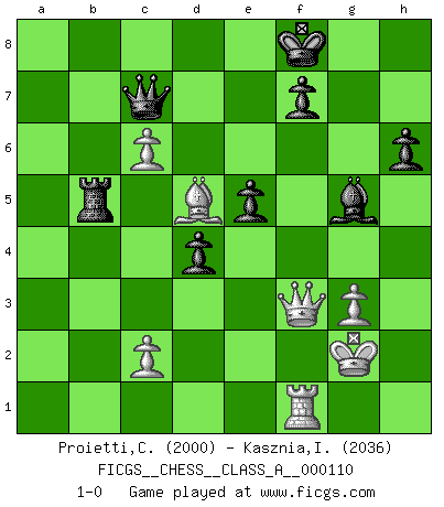 Last move : 1-0 2012 January 16 8:40:33 [Event "FICGS__CHESS__CLASS_A__000110"] [Site "FICGS"] [Date "2011.11.04"] [Round "1"] [White "Proietti,Costantino"] [Black "Kasznia,Ireneusz"] [Result "1-0"] [WhiteElo "2000"] [BlackElo "2036"] 1.e4 g6 2.Nf3 Bg7 3.d4 d6 4.Nc3 Nf6 5.Be2 O-O 6.O-O a6 7.a3 Nc6 8.Re1 e6 9.Be3 Rb8 10.h3 b5 11.Bd3 Qd7 12.b4 Bb7 13.Qb1 e5 14.d5 Ne7 15.a4 bxa4 16.Bd2 c6 17.dxc6 Bxc6 18.Bxa6 Qc7 19.b5 d5 20.Rxa4 d4 21.Nd5 Bxd5 22.exd5 Nfxd5 23.Ba5 Nb6 24.Qb3 Nf5 25.Bxb6 Rxb6 26.Rc4 Qd6 27.Nd2 Ne7 28.Ne4 Qe6 29.Qa4 Ra8 30.Rc5 h6 31.Nd2 Nd5 32.Qc4 Rd8 33.Nf3 Qd6 34.h4 Bf6 35.h5 gxh5 36.Nd2 Nc3 37.Rc6 Qb8 38.Ne4 Nxe4 39.Rxe4 Rxc6 40.bxc6 Qc7 41.Re1 Rb8 42.Qc5 Rb6 43.Bb5 h4 44.Kh1 Rb8 45.Bd3 Kg7 46.Qd5 Rb6 47.Be4 Bg5 48.g3 hxg3 49.fxg3 Rb8 50.Kg2 Bf6 51.Ra1 Bd8 52.Qc5 Be7 53.Qc4 Bg5 54.Qf1 Rb6 55.Qf3 Kf8 56.Rf1 Rb5 57.Bd5 1-0 Robatsch (Modern) defense Kingside Castling by player Black (move 5) Kingside Castling by player White (move 6) Player White won this chess game. Follow this game move after move (download)I am the best player in the world and I am here to prove it. (Bobby Fischer) Im Fernschach kannst du während dem Spiel rauchen. (John Christen Knudsen) Aquel que teme a un Peón de Reina aislado, debería de retirarse del Ajedrez. (Siegbert Tarrasch) Avant la finale, les dieux ont créé le milieu de partie. (Tarrasch) May the force be with you. (Han Solo in Star Wars ep.4)