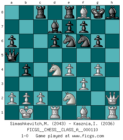Last move : 1-0 2011 December 20 12:4:59 [Event "FICGS__CHESS__CLASS_A__000110"] [Site "FICGS"] [Date "2011.11.04"] [Round "1"] [White "Simashkevitch,Mykola"] [Black "Kasznia,Ireneusz"] [Result "1-0"] [WhiteElo "2043"] [BlackElo "2036"] 1.e4 g6 2.d4 Bg7 3.Nc3 d6 4.Be3 Nf6 5.f3 O-O 6.Qd2 a6 7.O-O-O b5 8.g4 Nbd7 9.h4 b4 10.Nce2 c5 11.h5 Qa5 12.Kb1 Re8 13.dxc5 Nxc5 14.Nd4 Bd7 15.hxg6 hxg6 16.Bh6 Bh8 17.Qh2 Ne6 18.Nge2 Rac8 19.Bf8 1-0 Robatsch (Modern) defense Kingside Castling by player Black (move 5) Queenside Castling by player White (move 7) Player White won this chess game. Follow this game move after move (download)If one piece is badly posted, the whole game is bad. (Tarrasch) Vielleicht wirkt die Aura früherer Spieler glanzvoller als die der heutigen Spieler, aber das liegt daran, dass man kein Programm wie Fritz hatte, das einem all die Löcher in ihren Partien zeigt. (Vladimir Kramnik) Debió haber existido una vez en que los hombres eran semidióses, de otra manera no hubiesen podido inventar el Ajedrez. (Gustav Schenk) Les échecs sont plus proches de l'art de l'assassinat que de l'art de la guerre. (Arturo Perez-Reverte) The only difference between a tax man and a taxidermist is that the taxidermist leaves the skin. (Mark Twain)