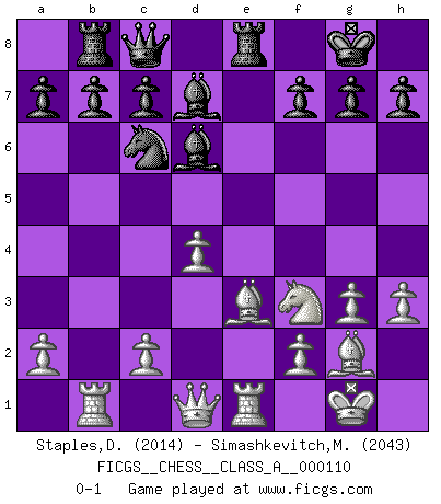 Last move : 0-1 2012 February 25 14:56:14 [Event "FICGS__CHESS__CLASS_A__000110"] [Site "FICGS"] [Date "2011.11.04"] [Round "1"] [White "Staples,Daniel"] [Black "Simashkevitch,Mykola"] [Result "0-1"] [WhiteElo "2014"] [BlackElo "2043"] 1.e4 e5 2.Nc3 Nf6 3.Nf3 Nc6 4.g3 d5 5.exd5 Nxd5 6.Bg2 Nxc3 7.bxc3 Bd6 8.O-O O-O 9.Rb1 Rb8 10.d4 Bg4 11.h3 Bd7 12.Re1 exd4 13.cxd4 Re8 14.Be3 Qc8 0-1 This chess game has been lost on time (started : 2011.11.04 17:40:25) Vienna : Falkbeer variation Kingside Castling by player White (move 8) Kingside Castling by player Black (move 8) Player Black won this chess game. Follow this game move after move (download)Good positions don't win games, good moves do. (Gerald Abrahams) Modernes Schach erfordert enorme Anspannung. Es ist für einen normalen Menschen unmöglich das auszuhalten. (Viktor Kortschnoi) Tu sabes, camarada Pachman, no disfruto el ser un Ministro, preferería jugar al Ajedrez como tu. (Che Guevara) À la honte des hommes, on sait que les lois du jeu sont les seules qui soient partout justes, claires, inviolables et exécutées. Pourquoi l'Indien qui a donné les règles du jeu d'échecs est-il obéi de bon gré dans toute la terre, et que les décrétales des papes, par exemple, sont aujourd'hui un objet d'horreur et de mépris ? C'est que l'inventeur des échecs combina tout avec justesse pour la satisfaction des joueurs, et que les papes, dans leurs décrétales, n'eurent en vue que leur seul avantage. L'Indien voulut exercer également l'esprit des hommes et leur donner du plaisir; les papes ont voulu abrutir l'esprit des hommes. Voltaire (Dictionnaire philosophique / Garnier 1967) . 'gn is not allowed in chess unless n is an integer between 1 and 8 inclusive, where 1 and 8 are to interpreted as the standard numerals standing for integers in the ordered real-closed field R, with the *canonical* ordering. (As opposed to, say, an integer in the domain Z[2+i*sqrt(5)] or an integer in some exotic Grothendieck topos). (Normajean Yates)