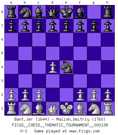Last move : 0-1 2012 January 15 18:19:51 [Event "FICGS__CHESS__THEMATIC_TOURNAMENT__000138"] [Site "FICGS"] [Date "2011.11.05"] [Round "1"] [White "Bant,Jer"] [Black "Malish,Dmitriy"] [Result "0-1"] [WhiteElo "1644"] [BlackElo "1760"] 1.d4 Nf6 2.e4 Nxe4 0-1 This chess game has been lost on time (started : 2011.11.05 11:31:48) Queen's pawn game Player Black won this chess game. Follow this game move after move (download)I look one move ahead... the best ! (Siegbert Tarrasch) Im Leben werden Partien nie so unstrittig gewonnen wie im Spiel (Emanuel Lasker) Por la belleza de sus partidas, la claridad de su juego y lo brillante de sus ideas, Fischer se creó el mismo como un artista de la misma estatura como Brahms, Rembrandt y Shakespeare. (David Levy) Aidez vos pièces, elles vous aideront. (Paul Morphy) Sometimes it pays to stay in bed in Monday, rather than spending the rest of the week debugging Monday's code. (Dan Salomon)