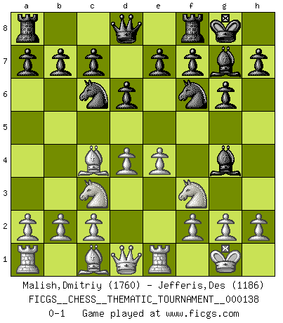 Last move : 0-1 2011 December 24 5:13:14 [Event "FICGS__CHESS__THEMATIC_TOURNAMENT__000138"] [Site "FICGS"] [Date "2011.11.05"] [Round "1"] [White "Malish,Dmitriy"] [Black "Jefferis,Des"] [Result "0-1"] [WhiteElo "1760"] [BlackElo "1186"] 1.d4 Nf6 2.e4 d6 3.Nc3 g6 4.Bc4 Bg7 5.Nf3 O-O 6.O-O Bg4 7.Re1 Nc6 0-1 This chess game has been lost on time (started : 2011.11.05 11:31:48) Queen's pawn game Kingside Castling by player Black (move 5) Kingside Castling by player White (move 6) Player Black won this chess game. Follow this game move after move (download)I like to say that Bobby Fischer was the greatest player ever. But what made Fischer a genius was his ability to blend an American freshness and pragmatism with Russian ideas about strategy. (Bruce Pandolfini) Spiel ein langweiliges Spiel zu Ende und lustige Dinge können passieren. (Hans Ree) Coloca el contenido de las piezas del Ajedrez en un sombrero, agitalo vigorosamente, arrojalas en un tablero desde una altura de 30 centimetros y así obtendras el estilo de Steinitz. (H. E. Bird) Que feriez-vous si vous étiez en train de jouer aux échecs et que la fin du monde arrive ? Je continuerais à jouer. (Saint Borromée) The obstacle is the path. (Zen proverb)