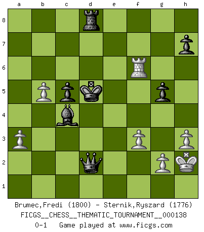 Last move : 0-1 2011 December 18 20:3:59 [Event "FICGS__CHESS__THEMATIC_TOURNAMENT__000138"] [Site "FICGS"] [Date "2011.11.05"] [Round "1"] [White "Brumec,Fredi"] [Black "Sternik,Ryszard"] [Result "0-1"] [WhiteElo "1800"] [BlackElo "1776"] 1.d4 Nf6 2.e4 Nxe4 3.Qf3 d5 4.Bd3 Nc6 5.Ne2 e5 6.Bxe4 Nxd4 7.Nxd4 dxe4 8.Qxe4 Qxd4 9.Qxd4 exd4 10.O-O Be6 11.Bf4 O-O-O 12.a3 Bc5 13.Nd2 Rhe8 14.b4 Bb6 15.Rfe1 f6 16.h3 g5 17.Bg3 Bf5 18.Rac1 Rxe1+ 19.Rxe1 Bxc2 20.f3 Kd7 21.Nc4 c5 22.Bd6 Bb3 23.Re7+ Kc6 24.b5+ Kd5 25.Nxb6+ Kxd6 26.Rxb7 d3 27.Nc4+ Bxc4 28.Rxa7 d2 29.Ra6+ Kd5 30.Rxf6 d1Q+ 31.Kh2 Qd2 0-1 Queen's pawn game Kingside Castling by player White (move 10) Queenside Castling by player Black (move 11) Promotion Queen by player Black (move 30) Player Black won this chess game. Follow this game move after move (download)When you don't know what to play, wait for an idea to come into your opponent's mind. You may be sure that idea will be wrong. (Siegbert Tarrasch) Ich hatte Angst gegen einen russischen Großmeister zu verlieren, und er befürchtete gegen einen kleinen Jungen zu verlieren. (über ein Remis gegen Juri Awerbach). (Robert James Fischer) El Ajedrez es realmente noventa y nueve por ciento calculación. (Soltis) Assurément je connaissais par expérience le mystérieux attrait de ce jeu royal, le seul entre tous les jeux inventés par les hommes qui échappe souverainement à la tyrannie du hasard, le seul où l'on ne doive sa victoire qu'à son intelligence ou plutôt à une certaine forme d'intelligence. Mais n'est-ce pas déjà le limiter injurieusement que d'appeler les échecs un jeu ? N'est-ce pas une science, un art ou quelque chose qui, comme le cercueil de Mahomet entre ciel et terre, est suspendu entre l'un et l'autre, et qui réunit un nombre incroyable de contraires ? [...] C'est une pensée qui ne mène à rien, une mathématique qui n'établit rien, un art qui ne laisse pas d'uvre, une architecture sans matière; et il l'a prouvé néanmoins qu'il était plus durable, à sa manière, que les livres ou que tout autre monument, ce jeu unique qui appartient à tous les peuples et à tous les temps, et dont personne ne sait quel dieu en fit don à la terre pour tuer l'ennui, pour aiguiser l'esprit et stimuler l'âme. Où commence-t-il, où finit-il ? (Stefan Zweig) Information on the Internet is subject to the same rules and regulations as conversation at a bar. (George Lundberg)