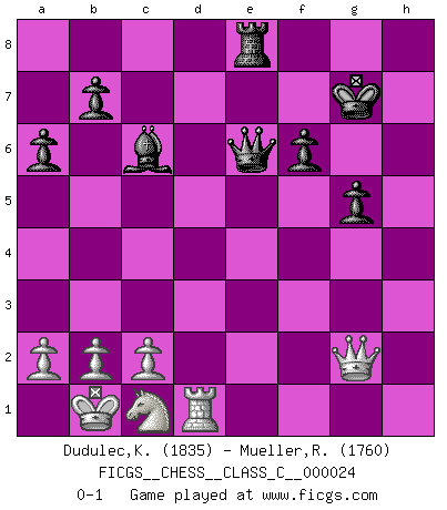 Last move : 0-1 2007 July 25 13:49:13 [Event "FICGS__CHESS__CLASS_C__000024"] [Site "FICGS"] [Date "2007.01.07"] [Round "1"] [White "Dudulec,Konstantin"] [Black "Mueller,Robert"] [Result "0-1"] [WhiteElo "1835"] [BlackElo "1760"] 1.e4 e6 2.d4 d5 3.Nd2 c5 4.exd5 exd5 5.Bb5+ Bd7 6.Qe2+ Be7 7.dxc5 Nf6 8.Ngf3 O-O 9.Nb3 Re8 10.Be3 a6 11.Bd3 Ba4 12.Nfd4 Nbd7 13.O-O-O Nxc5 14.Nf5 Nxd3+ 15.Qxd3 Bf8 16.Bg5 h6 17.Bh4 g5 18.Bg3 Bb5 19.Qd4 Re4 20.Qd2 Re2 21.Qd4 Qc8 22.Ne3 Bg7 23.Kb1 Qe6 24.Nc1 Rxf2 25.Bxf2 Ne4 26.Qb4 Nxf2 27.Nxd5 Nxd1 28.Rxd1 Qe5 29.Ne7+ Kh8 30.Rd5 Qxh2 31.g4 Qc7 32.Nf5 Qc4 33.Qd6 Qxg4 34.Nxh6 Qe6 35.Nf5 Re8 36.Qh2+ Kg8 37.Qg2 f6 38.Nxg7 Kxg7 39.Rd1 Bc6 0-1 French : Tarrasch, Open, 4.ed ed Kingside Castling by player Black (move 8) Queenside Castling by player White (move 13) Player Black won this chess game. Follow this game move after move (download)Chess is not like life... it has rules ! (Mark Pasternak) Capablanka war das größte Genie der Schachgeschichte! Aber denken sie nicht er habe nichts vom Schach verstanden. Er wusste nur soviel wie er wissen musste um seine Ziele zu erreichen. (Mikhail Moiseyevich Botvinik) Del Ajedrez se ha dicho que la vida no es lo suficientemente larga para él, pero eso es culpa de la vida, no del Ajedrez. (William Ewart Napier) Un footballeur joue avec ses pieds, parfois avec sa tête. Un joueur d'échecs ne joue qu'avec sa tête. Et quand il ne joue plus, il meurt. (Jacob Murray) The good fighters of old first put themselves beyond the possibility of defeat, and then waited for an opportunity of defeating the enemy. (Sun Tzu)