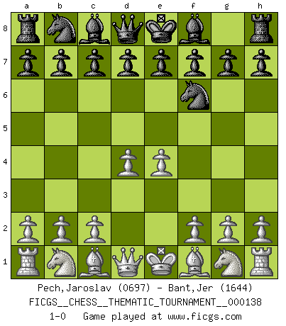 Last move : 1-0 2011 December 15 16:28:33 [Event "FICGS__CHESS__THEMATIC_TOURNAMENT__000138"] [Site "FICGS"] [Date "2011.11.05"] [Round "1"] [White "Pech,Jaroslav"] [Black "Bant,Jer"] [Result "1-0"] [WhiteElo "0697"] [BlackElo "1644"] 1.d4 Nf6 2.e4 1-0 This chess game has been lost on time (started : 2011.11.05 11:31:48) Queen's pawn game Player White won this chess game. Follow this game move after move (download)Chess is like life. (Boris Spassky) Es tut gut, die Entwicklungsperiode von, [...] demokratischem Geist durchdringen zu lassen. Wie undemokratisch wäre es doch beispielsweise, den einen Offizier große Spaziertouren vornehmen zu lassen, während die anderen zu Hause säßen und sich entsetzlich langweilten. (Aaron Nimzowitsch) La vida es como el Ajedrez, con lucha, competición y eventos buenos y malos. (Benjamin Franklin) Les échecs, c'est l'imagination. (David Bronstein) When you don't know what to do, walk fast and look worried. (Anonymous)