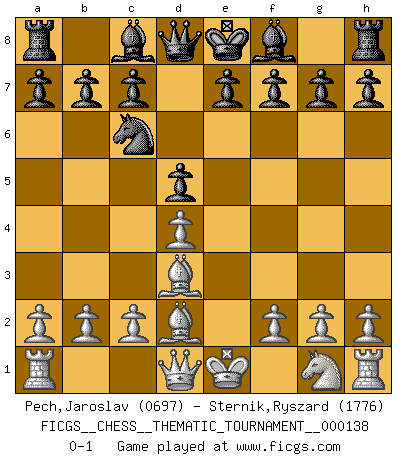 Last move : 0-1 2011 December 26 17:20:7 [Event "FICGS__CHESS__THEMATIC_TOURNAMENT__000138"] [Site "FICGS"] [Date "2011.11.05"] [Round "1"] [White "Pech,Jaroslav"] [Black "Sternik,Ryszard"] [Result "0-1"] [WhiteElo "0697"] [BlackElo "1776"] 1.d4 Nf6 2.e4 Nxe4 3.Bd3 d5 4.Nd2 Nxd2 5.Bxd2 Nc6 0-1 This chess game has been lost on time (started : 2011.11.05 11:31:48) Queen's pawn game Player Black won this chess game. Follow this game move after move (download)Robert Fischer is a law unto himself. (Larry Evans) Wenn Schach ein enormer Dschungel ist, der seine Myriaden von Geheimnissen nicht preisgeben will, dann sind Computer die Kettensägen einer gewaltigen ökologisch unsensiblen Nutzholzfirma. (Nigel Short) Yo nunca en mi vida he jugado la Defensa Francesa, que viene siendo la más aburrida de todas las Aperturas. (Wilhelm Steinitz) Fischer est le meilleur joueur du monde et Karpov n'est qu'un joueur de bistrot. (Garry Kasparov, agé de 16 ans) Real knowledge is to know the extent of one's ignorance. (Confucius)