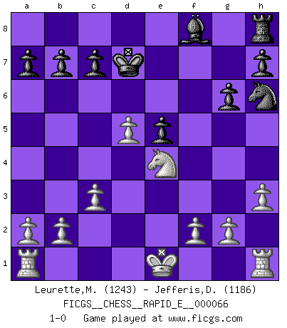 Last move : 1-0 2011 December 10 9:28:9 [Event "FICGS__CHESS__RAPID_E__000066"] [Site "FICGS"] [Date "2011.11.05"] [Round "1"] [White "Leurette,Marc-Antoine"] [Black "Jefferis,Des"] [Result "1-0"] [WhiteElo "1243"] [BlackElo "1186"] 1.e4 e5 2.Nf3 Nc6 3.Bc4 d6 4.h3 Nf6 5.Ng5 Be6 6.Nxe6 fxe6 7.Bxe6 Qe7 8.Bd5 Nxd5 9.exd5 Nd4 10.c3 Nf5 11.d4 O-O-O 12.Qg4 g6 13.Bg5 Qd7 14.Bxd8 Kxd8 15.Nd2 Nh6 16.Qxd7+ Kxd7 17.dxe5 dxe5 18.Ne4 1-0 King's pawn game Queenside Castling by player Black (move 11) Player White won this chess game. Follow this game move after move (download)A man that will take back a move at Chess will pick a pocket. (Richard Fenton) Ein Springer auf f6 gegen die eigene Rochadestellung ist schlimmer als ein rostiger Nagel im Knie. (Efim Bogoljubov) Fischer sacrificó virtualmente todo lo que la mayoría de nosotros los 'debiles' (término que él usa) valoramos, respetamos y apreciamos por el amor de un astuto, a menudo hermoso tablero de juego, por el privilegio ambivalente de ser su mas grande maestro. (Paul Kollar) Vous m'avez demandé de vous exposer quel est le fondement de la prière. Je ne fais que préparer les pièces du jeu sur la table... Nous sera-t-il permis d'en adopter les règles et si nous les appliquons scrupuleusement nous ne tarderons pas à faire mat le Roi divin ! Il ne pourra échapper à nos mains. (Sainte Thérèse d'Avila, Chemin de perfection) Coffee just isn't my cup of tea. (Unknown)