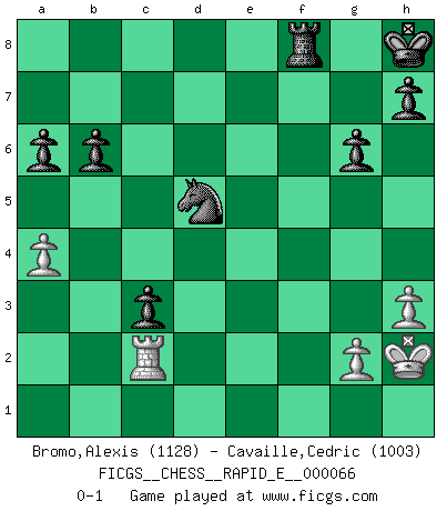 Last move : 0-1 2011 November 11 21:15:51 [Event "FICGS__CHESS__RAPID_E__000066"] [Site "FICGS"] [Date "2011.11.05"] [Round "1"] [White "Bromo,Alexis"] [Black "Cavaille,Cedric"] [Result "0-1"] [WhiteElo "1128"] [BlackElo "1003"] 1.d4 g6 2.c4 Bg7 3.e3 Nf6 4.Nc3 O-O 5.Nf3 d6 6.b4 c6 7.Bb2 Nbd7 8.a4 c5 9.bxc5 dxc5 10.d5 e6 11.dxe6 fxe6 12.Be2 a6 13.h3 b6 14.Ng5 Ne5 15.f4 Nc6 16.Qxd8 Nxd8 17.O-O Nd5 18.Nxd5 exd5 19.cxd5 Nf7 20.Bxg7 Kxg7 21.Ne6+ Bxe6 22.dxe6 Nd6 23.Rad1 Nf5 24.Rd7+ Kh8 25.Kh2 Rfe8 26.Bg4 Nxe3 27.Re1 Nxg4+ 28.Kg3 Nf6 29.Rf7 Nd5 30.e7 c4 31.Rf8+ Rxf8 32.exf8Q+ Rxf8 33.Kf3 Nxf4 34.Kg3 Nh5+ 35.Kh2 c3 36.Rc1 Nf4 37.Rc2 Nd5 0-1 Modern defense Kingside Castling by player Black (move 4) Kingside Castling by player White (move 17) Promotion Queen by player White (move 32) Player Black won this chess game. Follow this game move after move (download)Chess, like any creative activity, can exist only through the combined efforts of those who have creative talent, and those who have the ability to organize their creative work. (Mikhail Botvinnik) Frage des Reporters: -Worin besteht das Ziel von Gambiteröffnungen? Antwort: -Auf Kosten der Partie einen Ruf als Angriffspieler zu erwerben.- (Siegbert Tarrasch) Un jugador que es sorprendido, esta derrotado a medias. (Proverbio) Karpov est une pièce de musée. (Garry Kasparov) You can only get smarter by playing a smarter opponent. (Revolver, movie)