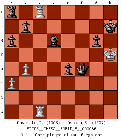 Last move : 0-1 2011 December 12 16:46:0 [Event "FICGS__CHESS__RAPID_E__000066"] [Site "FICGS"] [Date "2011.11.05"] [Round "1"] [White "Cavaille,Cedric"] [Black "Dsouza,Stanislaus"] [Result "0-1"] [WhiteElo "1003"] [BlackElo "1207"] 1.e4 e5 2.Nf3 Nc6 3.Bc4 h6 4.d4 d6 5.dxe5 Be6 6.Bxe6 fxe6 7.exd6 cxd6 8.Nc3 Nf6 9.O-O Be7 10.a3 O-O 11.b4 a6 12.Qe1 e5 13.Nd5 Nxd5 14.exd5 Rxf3 15.gxf3 Nd4 16.Qe4 Bf8 17.Be3 Nb5 18.Kh1 Qf6 19.c4 Nc3 20.Qc2 Qxf3+ 21.Kg1 Ne2+ 22.Qxe2 Qxe2 23.Rae1 Qxc4 24.Rc1 Qxd5 25.Rcd1 Qc6 26.Rc1 Qf3 27.Rc3 d5 28.Rfc1 Qg4+ 29.Kh1 d4 30.Rc4 Qf3+ 31.Kg1 dxe3 32.fxe3 Qxe3+ 33.Kg2 e4 34.R4c3 Qd2+ 35.Kg3 Bd6+ 36.Kh3 Qxh2+ 37.Kg4 Qf4+ 38.Kh3 Qh2+ 39.Kg4 h5+ 40.Kg5 Kh7 41.Rc8 Qf4+ 42.Kxh5 g6+ 0-1 King's pawn game Kingside Castling by player White (move 9) Kingside Castling by player Black (move 10) Player Black won this chess game. Follow this game move after move (download)The older I grow, the more I value pawns. (Paul Keres) Die jungen Leute sollen verstehen, dass sie noch etwas von mir lernen können und müssen. (Viktor Kortschnoi) Aún deseo matar a Fischer. (Boris Spassky) Il vaut toujours mieux jouer un plan faux de façon logique que de n'avoir pas de plan du tout. (Victor Kortchnoï) Quotation,n.: The act of repeating erroneously the words of another. The words erroneously repeated. (Ambrose Bierce, The Devil's Dictionary)