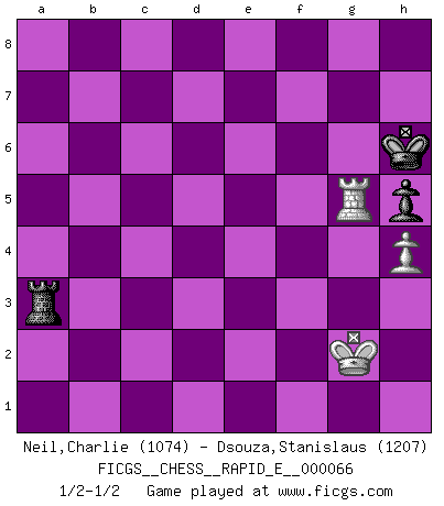 Last move : 1/2-1/2 2012 February 5 14:27:31 [Event "FICGS__CHESS__RAPID_E__000066"] [Site "FICGS"] [Date "2011.11.05"] [Round "1"] [White "Neil,Charlie"] [Black "Dsouza,Stanislaus"] [Result "1/2-1/2"] [WhiteElo "1074"] [BlackElo "1207"] 1.d4 d5 2.Nf3 Bf5 3.Nh4 Bd7 4.Nf3 Nc6 5.c4 e6 6.cxd5 exd5 7.Bf4 Bd6 8.Bxd6 cxd6 9.Nc3 Nf6 10.e3 Ne4 11.Rc1 O-O 12.Nxd5 Qa5+ 13.Nc3 Nxc3 14.bxc3 Bf5 15.Bd3 Ne7 16.O-O Bg6 17.Bxg6 Nxg6 18.Qc2 Rac8 19.c4 Qh5 20.h3 b6 21.a4 Nh4 22.Nxh4 Qxh4 23.d5 Rfe8 24.Kh1 Re5 25.f3 Rxe3 26.Qd2 Ra3 27.Qb4 Ra2 28.Qxd6 Qg5 29.Qh2 Rf2 30.Rce1 Rxf1+ 31.Rxf1 h5 32.Qd6 Rxc4 33.Qb8+ Kh7 34.Qxa7 Qxd5 35.Qxb6 Rxa4 36.Qb1+ g6 37.Qb6 Rd4 38.Qc7 Rd2 39.Qf4 Qa2 40.Rg1 Rf2 41.Qg3 Rb2 42.f4 Rb3 43.Qg5 Qf2 44.Qf6 Kg8 45.f5 Rb5 46.Qd8+ Kh7 47.fxg6+ Kxg6 48.Qd3+ Rf5 49.Qd6+ Rf6 50.Qd3+ Kg7 51.Qc3 Kh6 52.Qc1+ Qf4 53.Rf1 Qxc1 54.Rxc1 Rf2 55.Rc4 f5 56.Kg1 Re2 57.Kh2 Kg5 58.h4+ Kf6 59.Kh3 Ke5 60.Kg3 Re4 61.Rc5+ Kf6 62.Kh3 Re5 63.Rc6+ Re6 64.Rc8 Re7 65.Rc6+ Re6 66.Rc8 Kg7 67.Kg3 Re2 68.Rc6 Re1 69.Rd6 Rf1 70.Rb6 f4+ 71.Kh2 f3 72.gxf3 Rxf3 73.Rc6 Rf6 74.Rc5 Kh6 75.Rg5 Rg6 76.Rc5 Rd6 77.Kg3 Rd4 78.Re5 Rg4+ 79.Kh3 Ra4 80.Rb5 Ra3+ 81.Kg2 Rc3 82.Rg5 Ra3 1/2-1/2 Queen's pawn game Kingside Castling by player Black (move 11) Kingside Castling by player White (move 16) 10 pieces endgame at move 47 : White KQRPP , Black KQRPP WHITE : King + 1 Queen 1 Rook 2 Pawns BLACK : King + 1 Queen 1 Rook 2 Pawns 9 pieces endgame at move 53 : White KRPP , Black KQRPP WHITE : King + 1 Rook 2 Pawns BLACK : King + 1 Queen 1 Rook 2 Pawns 8 pieces endgame at move 54 : White KRPP , Black KRPP WHITE : King + 1 Rook 2 Pawns BLACK : King + 1 Rook 2 Pawns 7 pieces endgame at move 72 : White KRPP , Black KRP WHITE : King + 1 Rook 2 Pawns BLACK : King + 1 Rook 1 Pawn 6 pieces endgame at move 72 : White KRP , Black KRP WHITE : King + 1 Rook 1 Pawn BLACK : King + 1 Rook 1 Pawn This chess game ended in a draw. Follow this game move after move (download)I know people who have all the will in the world, but still can't play good Chess. (Bobby Fischer) Ich moechte nie einem Club beitreten, der Leute wie mich als Mitglieder aufnimmt. (Woody Allen) Preferería tener un Peón que un dedo. (Reuben Fine) Comme les marins qui ont mille raisons différentes d'aller en mer, les joueurs d'échecs en ont tout autant avant de s'installer devant une table et jouer... (Vincent Bertignac, philosophe) Wisdom begins at the end. (Daniel Webster)