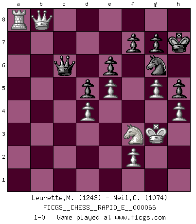 Last move : 1-0 2011 December 1 18:26:46 [Event "FICGS__CHESS__RAPID_E__000066"] [Site "FICGS"] [Date "2011.11.05"] [Round "1"] [White "Leurette,Marc-Antoine"] [Black "Neil,Charlie"] [Result "1-0"] [WhiteElo "1243"] [BlackElo "1074"] 1.e4 e6 2.d4 d5 3.Nc3 Bb4 4.e5 c5 5.Bb5+ Bd7 6.Bxd7+ Qxd7 7.Nf3 Nc6 8.a3 Bxc3+ 9.bxc3 Nge7 10.O-O cxd4 11.cxd4 Nf5 12.c3 Rc8 13.Qd3 O-O 14.Bf4 h6 15.g4 Nfe7 16.h4 Ng6 17.Qe3 Nxf4 18.Qxf4 Ne7 19.g5 h5 20.Kh2 Ng6 21.Qg3 Rxc3 22.a4 Rfc8 23.Qg2 R8c4 24.a5 Nf4 25.Qh1 b5 26.Rfd1 b4 27.Rac1 Qb5 28.Rxc3 Rxc3 29.Kg3 Ne2+ 30.Kg2 b3 31.Qe1 Nf4+ 32.Kg3 Ng6 33.Qxc3 b2 34.Qc2 Qxa5 35.Qxb2 Qa4 36.Ra1 Qd7 37.Qb8+ Kh7 38.Rxa7 Qc6 39.Ra8 1-0 French : Winawer, Advance variation Kingside Castling by player White (move 10) Kingside Castling by player Black (move 13) Player White won this chess game. Follow this game move after move (download)The passed pawn is a criminal, who should be kept under lock and key. Mild measures, such as police surveillance, are not sufficient. (Nimzovitch) Wenn ich mich einlogge, glauben die Leute gewöhnlich nicht, dass ich es selbst bin und sie fangen an, mir dumme Fragen zu stellen. Und wenn sie es glauben, stellen sie wieder andere dumme Fragen. (Judith Polgar) El Ajedrez es una guerra en un tablero. El objetivo es aplastar la mente del oponente. (Bobby Fischer) Shah mat. Le roi est mort. Cri de fierté d'un joueur venant de terrasser son adversaire, courtoisement, sans effusion de sang. Nowadays, anyone who cannot speak English and is incapable of using the Internet is regarded as backward. (Al-Waleed bin Talal)