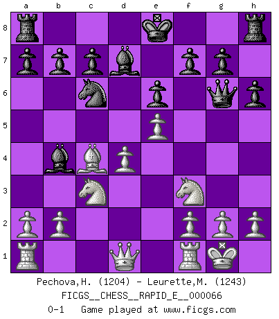 Last move : 0-1 2011 December 14 21:21:37 [Event "FICGS__CHESS__RAPID_E__000066"] [Site "FICGS"] [Date "2011.11.05"] [Round "1"] [White "Pechova,Hana"] [Black "Leurette,Marc-Antoine"] [Result "0-1"] [WhiteElo "1204"] [BlackElo "1243"] 1.d4 d5 2.c4 dxc4 3.Nf3 Nf6 4.Nc3 e6 5.e4 Bb4 6.Bg5 h6 7.Bxf6 Qxf6 8.Bxc4 Nc6 9.e5 Qg6 10.O-O Bd7 0-1 QGA, 4.Nc3 Kingside Castling by player White (move 10) Player Black won this chess game. Follow this game move after move (download)The combination player thinks forward; he starts from the given position, and tries the forceful moves in his mind. (Emanuel Lasker) Es gibt keine einzige Frau, der ich nicht einen Springer vorgeben könnte und trotzdem gewänne. (Robert James Fischer) El Ajedrez es la vida. (Bobby Fischer) J'apprécie les joueurs d'est-indienne, c'est grâce à eux que je nourris ma famille depuis tant d'années. (Petrosian) I'll be back. (Arnold Schwarzenegger)