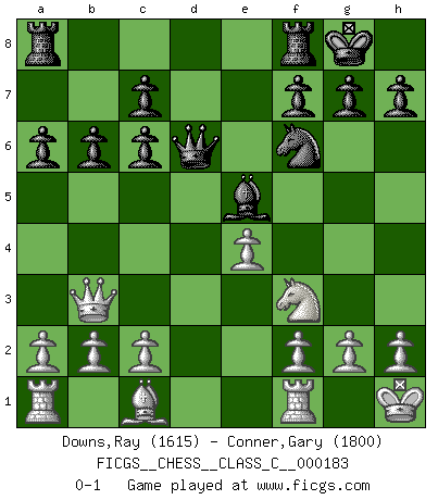 Last move : 0-1 2012 January 29 18:35:58 [Event "FICGS__CHESS__CLASS_C__000183"] [Site "FICGS"] [Date "2011.11.07"] [Round "1"] [White "Downs,Ray"] [Black "Conner,Gary"] [Result "0-1"] [WhiteElo "1615"] [BlackElo "1800"] 1.e4 e5 2.Nf3 Nc6 3.Bb5 a6 4.Bxc6 dxc6 5.O-O Bd6 6.d4 Bg4 7.dxe5 Bxf3 8.Qxf3 Bxe5 9.Qb3 b6 10.Nd2 Nf6 11.Kh1 O-O 12.Nf3 Qd6 0-1 This chess game has been lost on time (started : 2011.11.07 14:1:17) Ruy Lopez : Exchange variation, 5.O-O Kingside Castling by player White (move 5) Kingside Castling by player Black (move 11) Player Black won this chess game. Follow this game move after move (download)Chess is as much a mystery as women. (Purdy) Wenn Du absolut nicht mehr weißt, was Du tun sollst, dann ist es Zeit für Panik. (John van der Wiel) El Ajedrez es tan interesante por sí solo, que no es necesario un interés monetario para persuadir a una persona a que lo practique; por lo tanto, nunca se juega por dinero. (Benjamin Franklin) Le pion, dans sa simplicité, marche droit devant lui, mais lorsqu'il prend, il le fait obliquement? Ainsi l'homme, tant qu'il reste pauvre, marche dans la droiture et vit honnêtement, mais lorsqu'il recherche les honneurs, il flatte, se parjure et, par les voies obliques, cherche une position supérieure sur l'échiquier du monde. (Jean de Galles) Everybody lies. (Gregory House, House M.D.)