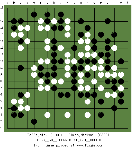 Last move : 1-0 2007 February 18 22:11:34 [Event "FICGS__GO__TOURNAMENT_KYU__000018"] [Site "FICGS"] [Date "2007.01.07"] [Round "1"] [Black "Ioffe,Nick"] [White "Simon,Mickael"] [Result "1-0"] [Rating 1 "1100"] [Rating 2 "0300"] 1.q17 d4 2.r4 d16 3.p3 r10 4.r8 r13 5.r15 k17 6.c10 k3 7.c6 g3 8.c14 f16 9.c17 c16 10.b16 b15 11.b17 c15 12.e18 d14 13.m17 k15 14.m15 n3 15.p5 p9 16.c3 c4 17.b4 b5 18.b3 c5 19.e2 d6 20.g18 n5 21.h16 f17 22.j16 k16 23.j18 h17 24.g17 g16 25.j17 k12 26.h14 g14 27.h13 g13 28.n9 p7 29.o6 r6 30.s6 s7 31.r7 q6 32.s5 s9 33.s8 n12 34.p12 p13 35.o13 o12 36.q13 p14 37.q14 p11 38.q12 n13 39.o14 n14 40.p15 n15 41.n16 m14 42.h11 f11 43.f10 e10 44.f9 e9 45.h9 f8 46.g8 f7 47.o11 o10 48.n11 n10 49.m11 k10 50.m10 m9 51.l9 m8 52.l10 k9 53.l8 m7 54.l7 j8 55.m6 o8 56.n6 n7 57.j6 g7 58.h7 h8 59.g9 g11 60.h10 j13 61.h12 m12 62.l13 l11 63.j11 k11 64.k6 c13 65.q10 p10 66.q11 q9 67.q8 r9 68.s11 1-0 Here are the names of the openings (joseki) played in the four corners : Corner q16 : q17 r13 Komoku (Somok, Xiao~mu`) 3-4 Point. The komoku (3-4) point is the traditional corner enclosure move.. Corner d4 : d4 c6 Hoshi (Hwajeom, Seongjeom, Xingwei`) 4-4 Point. The star or hoshi (4-4) point, emphasizing influence at the potential expense of territory. Ikken Kakari (Hankan Keolch'im, Yi Gua`jiao~, 1-Space Low Approach). Black 2 is the standard approach move to the 4-4. Corner d16 : d16 c14 Hoshi (Hwajeom, Seongjeom, Xingwei`) 4-4 Point. The star or hoshi (4-4) point, emphasizing influence at the potential expense of territory. Ikken Kakari (Hankan Keolch'im, Yi Gua`jiao~, 1-Space Low Approach). Black 2 is the standard approach move to the 4-4. Player Black won this Go (weiqi, baduk) game. Follow this game move after move (download)Go is not a blocking game, it's a game of action. (Pierre Audouard) God is an atheist. (Unknown)