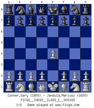 Last move : 1-0 2011 December 18 4:38:16 [Event "FICGS__CHESS__CLASS_C__000183"] [Site "FICGS"] [Date "2011.11.07"] [Round "1"] [White "Conner,Gary"] [Black "Jandula,Mariusz"] [Result "1-0"] [WhiteElo "1800"] [BlackElo "1600"] 1.e4 1-0 This chess game has been lost on time (started : 2011.11.07 14:1:17) King's pawn Opening Player White won this chess game. Follow this game move after move (download)When you absolutely don't know what to do anymore, it is time to panic. (John van der Wiel) Mutter, ich bin eben Ex-Weltmeister geworden. --beim nach Hause Kommen nach dem Verlust des WM-Titels an Mihail Botvinnik -- (Mikhail Nekhemyevich Tal) El Ajedrez es parte de la cultura, y si una cultura esta en decadencia, entonces también el Ajedrez declinará. (Mikhail Botvinnik) Je ne crois pas en la psychologie, je crois aux bons coups. (Robert Fischer) I don't know, I don't care, and it doesn't make any difference. (Albert Einstein)