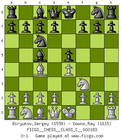Last move : 0-1 2011 December 20 4:44:52 [Event "FICGS__CHESS__CLASS_C__000183"] [Site "FICGS"] [Date "2011.11.07"] [Round "1"] [White "Biryukov,Sergey"] [Black "Downs,Ray"] [Result "0-1"] [WhiteElo "1598"] [BlackElo "1615"] 1.e4 e5 2.Nf3 Nc6 3.Bc4 Bc5 0-1 This chess game has been lost on time (started : 2011.11.07 14:1:17) Giuoco Piano Player Black won this chess game. Follow this game move after move (download)The hallmark of the artist is simplicity. (Larry Evans) Bis zum Jahr 1971 verlief in meiner Schachkariere alles glatt. Dieses dramatische Match [Fischer-Taimanov 6:0] machte mein Leben zur Hölle. (Mark Taimanov) El juego del Ajedrez no es solamente una diversión quieta; algunas cualidades muy valuables de la mente se pueden adquirir y cultivar con el, como convertirlos en habitos disponibles para toda ocasión; ya que la vida es algo así como el Ajedrez. (Benjamin Franklin) La vérité est comme le meilleur coup aux échecs : elle existe, mais il faut la chercher. (Arturo Perez-Reverte) Creativity is allowing yourself to make mistakes. Art is knowing which ones to keep. (Scott Adams)