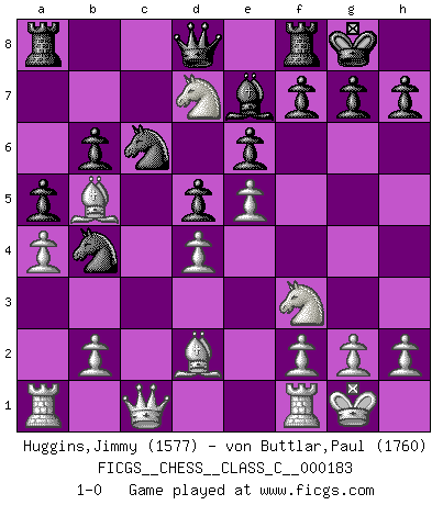 Last move : 1-0 2012 February 28 16:56:15 [Event "FICGS__CHESS__CLASS_C__000183"] [Site "FICGS"] [Date "2011.11.07"] [Round "1"] [White "Huggins,Jimmy"] [Black "von Buttlar,Paul"] [Result "1-0"] [WhiteElo "1577"] [BlackElo "1760"] 1.e4 e6 2.d3 d5 3.Nd2 Nf6 4.Ngf3 Bc5 5.e5 Nfd7 6.d4 Be7 7.Bd3 c5 8.c3 Nc6 9.O-O cxd4 10.cxd4 a5 11.a4 Nb4 12.Bb5 O-O 13.Nb3 Nb8 14.Bd2 N8c6 15.Qc1 Bd7 16.Nc5 b6 17.Nxd7 1-0 French : King's Indian attack Kingside Castling by player White (move 9) Kingside Castling by player Black (move 12) Player White won this chess game. Follow this game move after move (download)Chess is the gymnasium of the mind. (Blaise Pascal) Das typische an einem Großmeister ist, daß er eine gewonnene Position schnell und schmerzlos gewinnt. (Irving Chernev) El Ajedrez era la lengua materna de Capablanca. (Reti) Le moment que je préfère le plus dans une rencontre, c'est celui où je sens que la personnalité de l'adversaire se brise. (Robert Fischer) The meaning of life is that it is to be lived, and it is not to be traded and conceptualized and squeezed into a pattern of systems. (Bruce Lee)