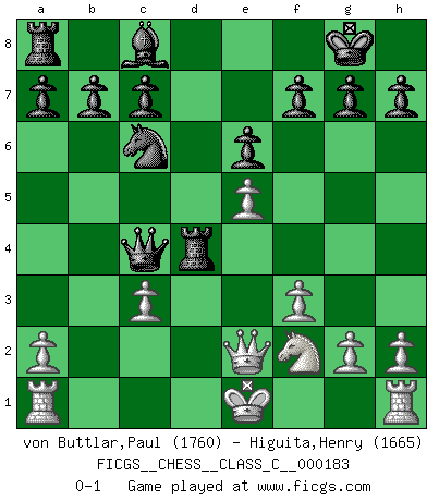 Last move : 0-1 2011 November 26 14:21:12 [Event "FICGS__CHESS__CLASS_C__000183"] [Site "FICGS"] [Date "2011.11.07"] [Round "1"] [White "von Buttlar,Paul"] [Black "Higuita,Henry"] [Result "0-1"] [WhiteElo "1760"] [BlackElo "1665"] 1.c4 e6 2.Nc3 Nf6 3.e4 Nc6 4.d4 Bb4 5.f3 O-O 6.Be3 d5 7.e5 Nd7 8.Nh3 dxc4 9.Bxc4 Ndxe5 10.dxe5 Bxc3+ 11.bxc3 Qh4+ 12.Nf2 Qxc4 13.Bd4 Rd8 14.Qe2 Rxd4 0-1 English Opening Kingside Castling by player Black (move 5) Player Black won this chess game. Follow this game move after move (download)When I have White, I win because I am white; When I have Black, I win because I am Bogolyubov. (Bogolyubov) Die Fehler sind da, Sie warten nur darauf gemacht zu werden. (Savielly Grigorievitsch Tartakower) No puedes jugar al Ajedrez si eres de corazón noble. (Proverbio Francés) Les Echecs sont affaire de jugement sensible. Savoir quand frapper et quand esquiver. (Fischer) My poor ole parrot... Is not in the circulation of displays ....poo hoo hoo :) (Wayne Lowrance's enigma)