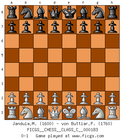 Last move : 0-1 2011 December 17 16:36:37 [Event "FICGS__CHESS__CLASS_C__000183"] [Site "FICGS"] [Date "2011.11.07"] [Round "1"] [White "Jandula,Mariusz"] [Black "von Buttlar,Paul"] [Result "0-1"] [WhiteElo "1600"] [BlackElo "1760"] 0-1 This chess game has been lost on time (started : 2011.11.07 14:1:17) Player Black won this chess game. Follow this game move after move (download)Examine moves that smite! A good eye for smites is far more important than a knowledge of strategical principles. (Purdy) Karpov ist ein Museumsstück. (Garry Kasparov) Si tu oponente no puede hacer nada activo, entonces no apures la posición; En vez de eso, dejalo estar sentado ahí, sufriendo y rogandote por un empate. (Jeremy Silman) Karpov est une pièce de musée. (Garry Kasparov) Shallow men believe in luck. Strong men belive in cause and effect. (Ralph Waldo Emerson)