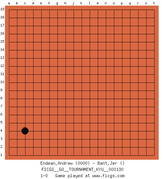 Last move : 1-0 2011 December 8 3:44:44 [Event "FICGS__GO__TOURNAMENT_KYU__000130"] [Site "FICGS"] [Date "2011.11.07"] [Round "1"] [Black "Endean,Andrew"] [White "Bant,Jer"] [Result "1-0"] [Rating 1 "0000"] 1.c4 1-0 This go game has been lost on time (started : 2011.11.07 15:30:48) Here are the names of the openings (joseki) played in the four corners : Corner d4 : c4 1-0 Komoku (Somok, Xiao~mu`) 3-4 Point. The komoku (3-4) point is the traditional corner enclosure move.. Player Black won this Go (weiqi, baduk) game. Follow this game move after move (download)Keep sente in the opening. A premature attack loses sente. (Anonymous) I teach you to lie, cheat and steal, and as soon as my back's turned you wait in line ? (Gregory House, House M.D.)
