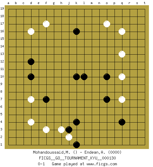 Last move : 0-1 2011 December 22 16:40:57 [Event "FICGS__GO__TOURNAMENT_KYU__000130"] [Site "FICGS"] [Date "2011.11.07"] [Round "1"] [Black "Mohandoussaid,Malik"] [White "Endean,Andrew"] [Result "0-1"] [Rating 2 "0000"] 1.k4 d16 2.q4 q16 3.d10 d4 4.k10 q10 5.k16 f17 6.l10 o17 7.o10 q7 8.o7 q13 9.d12 d7 10.f7 f3 11.k1 h3 12.j3 j2 0-1 Here are the names of the openings (joseki) played in the four corners : Corner q4 : q4 q7 Hoshi (Hwajeom, Seongjeom, Xingwei`) 4-4 Point. The star or hoshi (4-4) point, emphasizing influence at the potential expense of territory. Niken Takagakari (Dukan Nop'dakeolch'im, E`r Gaojia, 2-Space High Approach). White 2 is a light approach move. Rarely played in even games, White 2 is typically employed in handicap games. Black continues with 6-4 or 3-10. In Korean Sunjang Baduk Black has a stone on 8-4. Player White won this Go (weiqi, baduk) game. Follow this game move after move (download)Five groups might live but the six will die. (Anonymous) There is no vagueness without wind. (Chinese proverb)