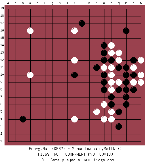 Last move : 1-0 2012 January 14 6:0:25 [Event "FICGS__GO__TOURNAMENT_KYU__000130"] [Site "FICGS"] [Date "2011.11.07"] [Round "1"] [Black "Bearg,Nat"] [White "Mohandoussaid,Malik"] [Result "1-0"] [Rating 1 "0587"] 1.q3 d16 2.r16 k4 3.c4 d10 4.l17 k16 5.k10 k12 6.r10 p10 7.o10 p9 8.o9 p8 9.p7 q7 10.p6 q6 11.q8 q9 12.r8 p5 13.o5 o4 14.q5 p4 15.r6 o6 16.r7 n5 17.o8 p11 18.q11 q12 19.p12 q13 20.o12 o11 21.n11 s9 22.r9 t9 23.s10 t10 24.s8 s11 25.r11 t12 26.s12 p13 27.o13 p14 28.o14 1-0 This go game has been lost on time (started : 2011.11.07 15:30:48) Here are the names of the openings (joseki) played in the four corners : Corner q4 : q3 p9 Komoku (Somok, Xiao~mu`) 3-4 Point. The komoku (3-4) point is the traditional corner enclosure move.. Player Black won this Go (weiqi, baduk) game. Follow this game move after move (download)Beginner's games are surprising, often incoherent and incomprehensible. When you improve, your game gains in consistency but flirts with stupidity: you become satisfied with truisms and mechanical movements, you try to obtain a feeling for clearness and style the easy way. (Pierre Audouard) A specialist learns more and more about less and less until he knows everything about nothing. (Nicholas Murray Butler)