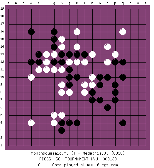 Last move : 0-1 2012 February 4 7:0:16 [Event "FICGS__GO__TOURNAMENT_KYU__000130"] [Site "FICGS"] [Date "2011.11.07"] [Round "1"] [Black "Mohandoussaid,Malik"] [White "Medearis,John"] [Result "0-1"] [Rating 2 "0336"] 1.k4 q16 2.q4 d4 3.d16 d10 4.k10 k16 5.q10 g4 6.h4 h5 7.h3 g5 8.j4 h9 9.j9 j8 10.j10 h8 11.d12 f11 12.h12 g13 13.h13 h11 14.j11 g11 15.g12 f13 16.e13 f12 17.e12 e11 18.o10 m10 19.n9 l8 20.n7 o8 21.p8 n8 22.m8 m9 23.m7 l9 24.n10 o7 25.o6 o9 26.p9 m13 27.p7 o12 28.p12 p13 29.q12 o14 30.g14 h14 31.g15 h15 32.g16 j12 33.j13 k12 34.k13 k14 35.l13 l12 0-1 This go game has been lost on time (started : 2011.11.07 15:30:48) Here are the names of the openings (joseki) played in the four corners : Player White won this Go (weiqi, baduk) game. Follow this game move after move (download)Go is to western chess what philosophy is to double entry accounting. (from Shibumi, by Trevanian) Luck never made a man wise. (Seneca, Letters to Lucilius)