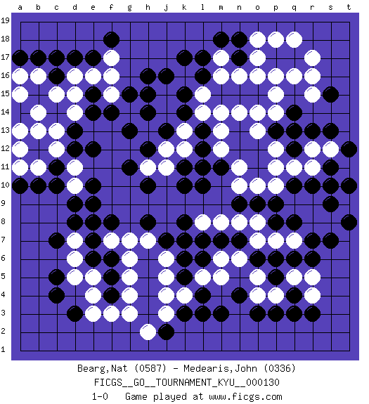 Last move : 1-0 2012 February 25 5:26:55 [Event "FICGS__GO__TOURNAMENT_KYU__000130"] [Site "FICGS"] [Date "2011.11.07"] [Round "1"] [Black "Bearg,Nat"] [White "Medearis,John"] [Result "1-0"] [Rating 1 "0587"] [Rating 2 "0336"] 1.q3 c15 2.d3 q16 3.d17 e16 4.k10 d10 5.r10 j3 6.k17 k16 7.q17 p16 8.p17 n16 9.n17 m17 10.m18 o17 11.n18 o18 12.l17 m16 13.l16 l14 14.k15 l15 15.j16 h15 16.h16 j14 17.m15 m14 18.n15 o16 19.o15 p14 20.k14 n14 21.c17 k12 22.j13 o14 23.g15 k13 24.l13 j15 25.h14 p15 26.l12 l11 27.k11 j12 28.h12 j11 29.m11 j15 30.h10 m12 31.l10 m13 32.l11 h13 33.g13 r17 34.q13 p12 35.q12 r16 36.q14 p18 37.c10 q18 38.k3 k4 39.l3 j4 40.m3 f15 41.f14 f16 42.e14 d14 43.e17 f17 44.f18 d16 45.c16 b14 46.e15 d15 47.d13 c13 48.c11 c12 49.d12 d11 50.e12 b16 51.b17 a16 52.a17 a15 53.b12 b13 54.d9 b11 55.b10 a12 56.e10 j14 57.h15 a11 58.a10 a13 59.k5 l5 60.l4 j5 61.k6 m6 62.l6 m5 63.m7 o7 64.n7 n6 65.o6 o5 66.p6 p7 67.p5 o4 68.o3 p4 69.q4 q5 70.q6 r5 71.r6 r4 72.p3 q7 73.n4 f3 74.f4 g4 75.r7 r8 76.q8 q9 77.p8 o8 78.p9 p10 79.o9 n8 80.n9 m8 81.l7 l8 82.k8 j6 83.k7 h11 84.g11 e4 85.f5 e5 86.f6 f7 87.e6 d6 88.e7 e8 89.f8 g7 90.d8 e3 91.c4 d5 92.c5 d7 93.c7 g5 94.e9 g6 95.e8 q11 96.q10 r9 97.s9 s8 98.s7 r11 99.t8 o10 100.s11 r12 101.r13 s12 102.s13 t11 103.s10 n10 104.t10 n11 105.t12 p11 106.p13 o13 107.j7 h7 108.h8 g3 109.j2 h2 110.s15 r15 111.r3 1-0 Here are the names of the openings (joseki) played in the four corners : Corner d16 : c15 d17 Mokuhazushi (Waemok, Wai`mu`) 5-3 Point. The mokuhazushi (5-3) point was popular in the Edo period in Japan (1600 - 1867). It emphasizes influence; territorially, it is inferior to the 3-4 point. Komoku Kakari. Black 2 is the standard approach because of its solidity and stability. Corner d4 : d3 j3 Komoku (Somok, Xiao~mu`) 3-4 Point. The komoku (3-4) point is the traditional corner enclosure move.. Corner q16 : q16 q17 Hoshi (Hwajeom, Seongjeom, Xingwei`) 4-4 Point. The star or hoshi (4-4) point, emphasizing influence at the potential expense of territory. Player Black won this Go (weiqi, baduk) game. Follow this game move after move (download)Atari, atari is vulgar play. (Anonymous) The best teachers teach from the heart, not from the book. (Author unknown)