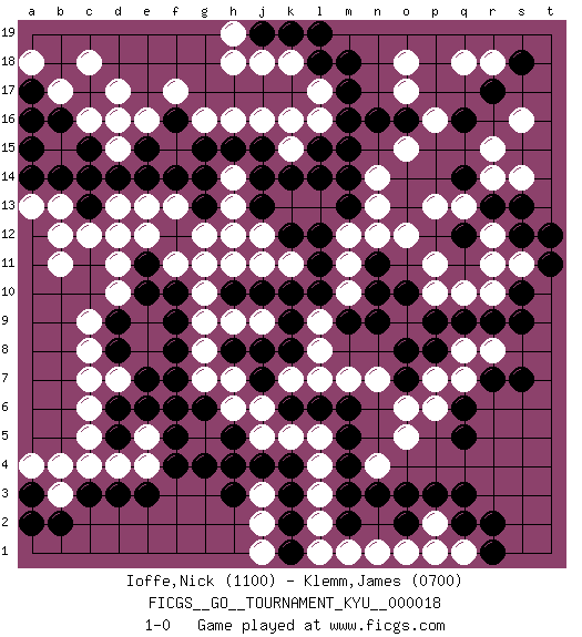 Last move : 1-0 2007 February 4 19:43:20 [Event "FICGS__GO__TOURNAMENT_KYU__000018"] [Site "FICGS"] [Date "2007.01.07"] [Round "1"] [Black "Ioffe,Nick"] [White "Klemm,James"] [Result "1-0"] [Rating 1 "1100"] [Rating 2 "0700"] 1.q16 d4 2.q3 c16 3.r9 d10 4.j4 o17 5.m17 o15 6.q14 q18 7.r17 l16 8.m16 l17 9.m15 n14 10.l14 q10 11.q9 k15 12.k14 p10 13.o8 l5 14.f4 o12 15.j15 j16 16.h15 h16 17.g15 l3 18.c3 c4 19.d3 e4 20.e3 g16 21.n3 r12 22.s13 o5 23.q5 n4 24.o3 l8 25.m9 l9 26.l10 m10 27.n9 m11 28.k10 h7 29.f6 d7 30.f8 h9 31.h10 g9 32.f9 g10 33.f10 g11 34.j8 g7 35.f7 j5 36.k4 k5 37.h5 h4 38.h3 g5 39.g4 h6 40.f5 h4 41.k8 l7 42.k2 h13 43.g13 j11 44.k12 k11 45.l11 j12 46.l12 f11 47.e11 f13 48.f14 e13 49.j13 h14 50.h12 g12 51.j10 h11 52.g14 d11 53.l18 k18 54.m18 m12 55.f16 f17 56.d16 e16 57.c15 d15 58.d14 d17 59.e14 c14 60.c13 b15 61.d12 b11 62.m13 n13 63.m14 r18 64.s18 e12 65.e10 o18 66.b14 b12 67.c15 s11 68.b16 c14 69.h8 g8 70.c15 r15 71.a15 r14 72.r13 q13 73.s10 r10 74.s9 p6 75.q6 p7 76.p8 q7 77.r7 q8 78.p9 n7 79.m6 k7 80.j7 j6 81.l6 l4 82.m3 m7 83.o7 o6 84.m4 l2 85.m5 j3 86.k3 j2 87.h5 r8 88.s7 h4 89.k1 l1 90.h5 c12 91.g6 d13 92.k6 b17 93.d6 c6 94.d5 c5 95.d9 c9 96.q12 p13 97.t11 s16 98.o16 p16 99.d8 c8 100.a17 a18 101.a16 c18 102.k19 j18 103.j19 h19 104.l19 h18 105.s12 r11 106.o10 p11 107.n16 s14 108.t12 b13 109.c14 h12 110.j14 o1 111.o2 n1 112.m2 m1 113.q2 b3 114.b2 b4 115.a3 a4 116.a2 q1 117.r1 p1 118.r2 d12 119.e7 c7 120.e15 e5 121.d16 j9 122.k9 d15 123.n11 n12 124.d16 j1 125.h4 d15 126.e6 d16 127.l15 a13 128.a14 k16 129.n10 p2 130.p3 1-0 Here are the names of the openings (joseki) played in the four corners : Corner d4 : d4 j4 Hoshi (Hwajeom, Seongjeom, Xingwei`) 4-4 Point. The star or hoshi (4-4) point, emphasizing influence at the potential expense of territory. Corner q16 : q16 o17 Hoshi (Hwajeom, Seongjeom, Xingwei`) 4-4 Point. The star or hoshi (4-4) point, emphasizing influence at the potential expense of territory. Ikken Kakari (Hankan Keolch'im, Yi Gua`jiao~, 1-Space Low Approach). White 2 is the standard approach move to the 4-4. Corner d16 : c16 j15 Komoku (Somok, Xiao~mu`) 3-4 Point. The komoku (3-4) point is the traditional corner enclosure move.. Player Black won this Go (weiqi, baduk) game. Follow this game move after move (download)To emphasize the lack of determination in his moves, one speaks of chance. (Pierre Audouard) The only thing that overcomes hard luck is hard work. (Harry Golden)