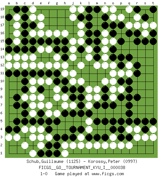 Last move : 1-0 2012 February 21 21:40:59 [Event "FICGS__GO__TOURNAMENT_KYU_I__000038"] [Site "FICGS"] [Date "2011.11.09"] [Round "1"] [Black "Schub,Guillaume"] [White "Korossy,Peter"] [Result "1-0"] [Rating 1 "1125"] [Rating 2 "0997"] 1.q16 d4 2.c16 e17 3.d14 h16 4.l16 k17 5.l17 k16 6.l15 q4 7.c6 c8 8.e6 f3 9.c10 c12 10.e9 d10 11.c9 d9 12.b8 d8 13.b7 d6 14.d5 d7 15.e5 c4 16.c5 e8 17.c11 d12 18.d11 e12 19.e11 e10 20.f11 f10 21.g14 e14 22.e15 f14 23.f15 g13 24.h13 g12 25.g11 h12 26.h15 g16 27.g15 f12 28.h10 g8 29.j9 k12 30.h6 g6 31.g5 f6 32.f5 h7 33.j6 h8 34.k8 f7 35.k7 j13 36.h3 j15 37.c18 e18 38.q6 o3 39.q10 b17 40.d17 d18 41.c17 b15 42.b14 k3 43.j4 l4 44.q13 q8 45.o7 p6 46.q7 p7 47.r8 p9 48.q9 r17 49.r16 q17 50.p17 p18 51.o17 o18 52.n18 s16 53.s15 s17 54.r15 o12 55.p8 o8 56.q8 o10 57.n8 o9 58.p5 o6 59.o5 n6 60.n5 m6 61.q5 r4 62.r5 b13 63.a14 o15 64.o13 n13 65.o14 n14 66.p15 n16 67.n17 q12 68.r12 q11 69.r11 l9 70.m5 l5 71.l6 l7 72.k6 l8 73.m7 b16 74.c15 b18 75.b19 k10 76.t16 l14 77.b4 b3 78.b5 a3 79.e3 e4 80.f4 e2 81.g3 d3 82.f2 e3 83.g2 c2 84.n3 n2 85.m3 m2 86.l3 l2 87.k4 j2 88.k18 j18 89.l18 j19 90.r19 q19 91.s18 r18 92.t19 t17 93.t15 o19 94.s4 s3 95.p3 p2 96.q3 r3 97.p4 q2 98.s5 t4 99.t5 t3 100.o4 o2 101.n9 n10 102.k14 j14 103.m14 l13 104.m15 n15 105.m13 m12 106.p12 p11 107.p13 e16 108.a18 k15 109.h14 f16 110.d15 c13 111.c14 d19 112.c19 d13 113.a15 j11 114.o16 m9 115.p10 o11 116.b11 g9 117.j3 k2 118.a4 a12 119.a11 k19 120.l19 n19 121.m16 n12 122.m19 h1 123.e1 d1 124.f1 h2 125.k9 j10 126.h9 h11 127.g10 m8 128.n7 a13 129.c7 e7 130.pass j7 131.j8 b12 132.g1 d16 133.pass 1-0 Here are the names of the openings (joseki) played in the four corners : Corner d16 : c16 e17 Komoku (Somok, Xiao~mu`) 3-4 Point. The komoku (3-4) point is the traditional corner enclosure move.. Ikken Kakari (Hankan Keolch'im, Yi Gua`jiao~, 1-Space Low Pincer). The small knight move is the basic approach move to the 3-4 point stone. It has been continually used for over four centuries. There are limitless variations, with new moves constantly being discovered. White 2 opens the door to a treaure store of joseki. Corner d4 : d4 c6 Hoshi (Hwajeom, Seongjeom, Xingwei`) 4-4 Point. The star or hoshi (4-4) point, emphasizing influence at the potential expense of territory. Ikken Kakari (Hankan Keolch'im, Yi Gua`jiao~, 1-Space Low Approach). Black 2 is the standard approach move to the 4-4. Corner q4 : q4 q6 Hoshi (Hwajeom, Seongjeom, Xingwei`) 4-4 Point. The star or hoshi (4-4) point, emphasizing influence at the potential expense of territory. Ikken Takagakari (Hankan Nop'dakeolch'im, Yi Gaojia, 1-Space High Approach). White typically responds at 6-4 or 3-10. White 4-10 is played when White finds play on the right side advantageous. White 4-8 or 3-8 may be played when White has support at top. Player Black won this Go (weiqi, baduk) game. Follow this game move after move (download)Use a wall to attack, not to make territory. (Anonymous) You must have a dream in order to have it come true. (A.P.J. Kalam)