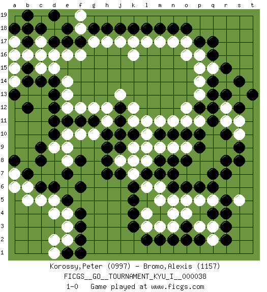 Last move : 1-0 2012 January 6 16:59:41 [Event "FICGS__GO__TOURNAMENT_KYU_I__000038"] [Site "FICGS"] [Date "2011.11.09"] [Round "1"] [Black "Korossy,Peter"] [White "Bromo,Alexis"] [Result "1-0"] [Rating 1 "0997"] [Rating 2 "1157"] 1.q16 d4 2.q4 d16 3.c14 c15 4.d14 d15 5.d10 k16 6.k4 q10 7.r13 p14 8.q14 p15 9.p17 o16 10.c6 c5 11.d6 d5 12.f3 e3 13.f4 e4 14.r8 q8 15.r7 r9 16.o3 o5 17.p6 p7 18.o6 n5 19.n6 m5 20.l7 m6 21.m7 l6 22.k6 p5 23.q6 q5 24.r5 l4 25.k3 l3 26.m2 m3 27.l2 n4 28.k5 n3 29.n2 p3 30.p2 q3 31.r3 q2 32.r2 o4 33.o2 e14 34.d13 e13 35.d12 e12 36.p9 p8 37.p10 q9 38.q11 r11 39.q12 r12 40.s9 s10 41.s8 s13 42.s14 p13 43.q13 q15 44.r15 p11 45.s12 s11 46.t13 o9 47.o10 o11 48.n10 n9 49.m10 m9 50.o8 o7 51.n8 l9 52.n7 l10 53.q7 m11 54.r10 n11 55.h10 h11 56.g11 g12 57.f11 f12 58.j11 h12 59.k10 l11 60.j12 j13 61.e5 k12 62.n18 n17 63.m18 m17 64.l18 l17 65.j18 j17 66.h18 h17 67.g18 g17 68.f17 f16 69.e17 e16 70.d17 c17 71.c18 b18 72.b17 c16 73.b19 b16 74.a18 a16 75.b14 a17 76.b18 d18 77.e18 f18 78.d19 f19 79.k18 k17 80.e11 o17 81.o18 p16 82.q17 b6 83.b7 b5 84.c8 k9 85.j9 j8 86.h8 k8 87.j7 k7 88.h7 k11 89.j10 g10 90.h9 f10 91.f6 e10 92.d11 e9 93.f8 e8 94.e7 d9 95.c9 a14 96.a13 a15 97.b12 a7 98.a8 a6 99.f2 e2 100.e1 d1 101.f1 d2 102.p12 o12 103.m8 l8 104.b15 s5 105.r4 1-0 Here are the names of the openings (joseki) played in the four corners : Corner d16 : d16 c14 Hoshi (Hwajeom, Seongjeom, Xingwei`) 4-4 Point. The star or hoshi (4-4) point, emphasizing influence at the potential expense of territory. Ikken Kakari (Hankan Keolch'im, Yi Gua`jiao~, 1-Space Low Approach). Black 2 is the standard approach move to the 4-4. Corner d4 : d4 c6 Hoshi (Hwajeom, Seongjeom, Xingwei`) 4-4 Point. The star or hoshi (4-4) point, emphasizing influence at the potential expense of territory. Ikken Kakari (Hankan Keolch'im, Yi Gua`jiao~, 1-Space Low Approach). Black 2 is the standard approach move to the 4-4. Player Black won this Go (weiqi, baduk) game. Follow this game move after move (download)Don't make compact groups of stones. (Anonymous) May I never be complete. May I never be content. May I never be perfect. Deliver me, Tyler, from being perfect and complete. (Chuck Palahniuk, Fight Club)