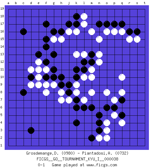 Last move : 0-1 2012 March 31 22:58:3 [Event "FICGS__GO__TOURNAMENT_KYU_I__000038"] [Site "FICGS"] [Date "2011.11.09"] [Round "1"] [Black "Grosdemange,David"] [White "Piantadosi,Angelo"] [Result "0-1"] [Rating 1 "0980"] [Rating 2 "0732"] 1.c16 q4 2.d3 q16 3.f17 k16 4.k4 q10 5.d10 k13 6.k10 m10 7.k7 m8 8.m6 l7 9.l6 k8 10.j8 k9 11.j9 j7 12.k6 h7 13.h10 h8 14.h9 f8 15.f10 e9 16.c8 e10 17.f12 e11 18.f14 f11 19.g11 f9 20.g10 g9 21.g13 e12 22.e13 d11 23.n17 n15 24.k17 l17 25.k18 l18 26.j17 j16 27.h16 h15 28.g16 g15 29.f15 d9 30.o6 o8 31.p17 p16 32.q17 o16 33.r16 r15 34.s16 s15 35.o17 m16 36.q7 p7 37.p6 q8 38.q5 p5 39.n5 o4 40.n4 o3 41.n3 n2 42.m2 o2 43.l11 l10 44.k11 m11 45.l12 l13 46.m12 n12 47.m13 n13 0-1 This go game has been lost on time (started : 2011.11.09 0:9:26) Here are the names of the openings (joseki) played in the four corners : Corner q16 : q16 n17 Hoshi (Hwajeom, Seongjeom, Xingwei`) 4-4 Point. The star or hoshi (4-4) point, emphasizing influence at the potential expense of territory. Niken Kakari (Dukan Keolch'im, E`r Gua`jiao~, 2-Space Low Approach). White typically answers by 7-3 or 3-5 (which is not joseki). Player White won this Go (weiqi, baduk) game. Follow this game move after move (download)If you have lost four corners, resign. (Anonymous) If you ain't just a little scared when you enter a casino, you are either very rich or you haven't studied the games enough. (Pappy)