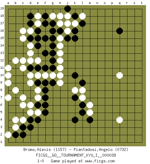Last move : 1-0 2012 February 13 7:22:57 [Event "FICGS__GO__TOURNAMENT_KYU_I__000038"] [Site "FICGS"] [Date "2011.11.09"] [Round "1"] [Black "Bromo,Alexis"] [White "Piantadosi,Angelo"] [Result "1-0"] [Rating 1 "1157"] [Rating 2 "0732"] 1.q16 d16 2.d4 q4 3.k10 q10 4.k4 d10 5.k16 c6 6.e14 d14 7.e6 d5 8.e4 e5 9.f5 d6 10.d7 e7 11.f6 c7 12.d8 e8 13.c9 d9 14.c8 b8 15.b9 a7 16.c10 c11 17.b11 a9 18.b10 b12 19.d11 c12 20.e9 e10 21.f9 a11 22.e16 e12 23.e11 f10 24.f11 g10 25.g9 h10 26.g11 h9 27.f8 a10 28.f7 c4 29.c3 b4 30.d3 b3 31.b2 a2 32.c2 h11 33.g12 h12 34.g13 h13 35.g14 h14 36.g15 h15 37.h16 j16 38.j15 j17 39.k15 h17 40.g16 k17 41.l17 e15 42.f15 e17 43.d15 c15 44.e15 d13 45.f13 d12 46.f17 e18 47.g17 g18 48.k18 j18 49.j19 h18 50.f18 l18 51.d17 c16 52.d18 k8 53.k7 l8 54.l9 l7 55.l6 m6 56.l5 m5 57.m4 1-0 This go game has been lost on time (started : 2011.11.09 0:9:26) Here are the names of the openings (joseki) played in the four corners : Corner d4 : d4 c6 Hoshi (Hwajeom, Seongjeom, Xingwei`) 4-4 Point. The star or hoshi (4-4) point, emphasizing influence at the potential expense of territory. Ikken Kakari (Hankan Keolch'im, Yi Gua`jiao~, 1-Space Low Approach). White 2 is the standard approach move to the 4-4. Corner d16 : d16 e14 Hoshi (Hwajeom, Seongjeom, Xingwei`) 4-4 Point. The star or hoshi (4-4) point, emphasizing influence at the potential expense of territory. Player Black won this Go (weiqi, baduk) game. Follow this game move after move (download)In the opening, when you don't know what to play, make a shimari. (Jansteen) Always be a first-rate version of yourself, instead of a second-rate version of somebody else. (Judy Garland)