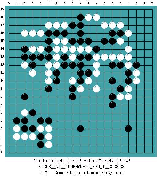 Last move : 1-0 2012 April 16 11:45:49 [Event "FICGS__GO__TOURNAMENT_KYU_I__000038"] [Site "FICGS"] [Date "2011.11.09"] [Round "1"] [Black "Piantadosi,Angelo"] [White "Hoedtke,Matthias"] [Result "1-0"] [Rating 1 "0732"] [Rating 2 "0800"] 1.q4 c16 2.d4 q16 3.k4 c6 4.c8 c3 5.c4 d3 6.e3 b4 7.b5 b3 8.c5 f3 9.e2 e4 10.e5 f4 11.f5 f2 12.d6 e16 13.k16 h17 14.k17 n17 15.n15 q14 16.q10 n13 17.m14 m12 18.k12 k14 19.l13 h15 20.j15 j13 21.k13 j14 22.k15 l14 23.l15 m13 24.j12 g13 25.h12 g12 26.g11 f11 27.g10 j10 28.j8 l10 29.l11 m11 30.k10 k9 31.k11 m9 32.j9 q8 33.p9 p8 34.o8 q9 35.o10 r10 36.q11 r11 37.r12 q12 38.p12 q13 39.o15 p13 40.o12 o13 41.o7 p17 42.p16 p15 43.o16 o17 44.h16 g15 45.g16 g17 46.j17 l18 47.k18 m18 48.f16 f17 49.f15 g14 50.f14 e14 51.f13 f12 52.e13 d14 53.d13 d11 54.c13 c12 55.c14 d16 56.h13 h14 57.d12 f10 58.f9 1-0 This go game has been lost on time (started : 2011.11.09 0:9:26) Here are the names of the openings (joseki) played in the four corners : Corner d4 : d4 c6 Hoshi (Hwajeom, Seongjeom, Xingwei`) 4-4 Point. The star or hoshi (4-4) point, emphasizing influence at the potential expense of territory. Ikken Kakari (Hankan Keolch'im, Yi Gua`jiao~, 1-Space Low Approach). White 2 is the standard approach move to the 4-4. Corner q4 : q4 m9 Hoshi (Hwajeom, Seongjeom, Xingwei`) 4-4 Point. The star or hoshi (4-4) point, emphasizing influence at the potential expense of territory. Player Black won this Go (weiqi, baduk) game. Follow this game move after move (download)Josekis are not fixed, definitive things. They indicate the moments when everything can change. (Pierre Audouard) Luck is when opportunity knocks and you answer. (Anonymous)