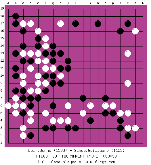 Last move : 1-0 2011 December 8 10:44:17 [Event "FICGS__GO__TOURNAMENT_KYU_I__000038 "] [Site "FICGS"] [Date "2011.11.09"] [Round "1"] [Black "Wolf,Bernd "] [White "Schub,Guillaume "] [Result "1-0"] [Rating 1 "1393"] [Rating 2 "1125"] 1.q16 d4 2.q3 r5 3.c16 r3 4.r2 s3 5.q4 q5 6.p5 r9 7.f3 c6 8.d2 c3 9.j3 e16 10.c14 c17 11.b17 d17 12.b18 h17 13.n17 r13 14.c8 c2 15.b6 b7 16.c7 b5 17.d6 a6 18.o7 s16 19.r17 f5 20.k17 p6 21.o5 c10 22.c5 b6 23.b8 d5 24.f8 e10 25.f10 e9 26.e7 f11 27.g10 g11 28.h11 e12 29.g6 g4 30.g3 h4 31.e14 h12 32.j11 j4 33.k3 j6 34.j12 h10 35.h9 m6 36.l7 l5 37.m4 o6 38.h13 f14 39.f13 e13 40.e15 g13 41.g14 f15 42.g12 f12 43.g13 e8 44.b10 c9 45.b11 d8 46.d7 d11 47.d12 d13 48.c12 c13 49.b13 f9 50.g9 1-0 Here are the names of the openings (joseki) played in the four corners : Corner q4 : q3 r5Komoku (Somok, Xiao~mu`) 3-4 Point. The komoku (3-4) point is the traditional corner enclosure move..Ikken Kakari (Hankan Keolch'im, Yi Gua`jiao~, 1-Space Low Pincer). The small knight move is the basic approach move to the 3-4 point stone. It has been continually used for over four centuries. There are limitless variations, with new moves constantly being discovered. White 2 opens the door to a treaure store of joseki. Corner d4 : d4 f3Hoshi (Hwajeom, Seongjeom, Xingwei`) 4-4 Point. The star or hoshi (4-4) point, emphasizing influence at the potential expense of territory.Ikken Kakari (Hankan Keolch'im, Yi Gua`jiao~, 1-Space Low Approach). Black 2 is the standard approach move to the 4-4. Corner d16 : c16 e16Komoku (Somok, Xiao~mu`) 3-4 Point. The komoku (3-4) point is the traditional corner enclosure move..Ikken Takagakari (Hankan Nop'dakeolch'im, Yi Gaogua`jiao~, 1-Space High Approach). The 5-4 approach move has become more popular in modern times, as modern Go emphasizes speed and influence. Player Black won this Go (weiqi, baduk) game.Follow this game move after move (download ) White is always trying to kill a bigger group than black is trying to save. (Anonymous) Some people are so afraid to die that they never begin to live. (Henry Van Dyke)