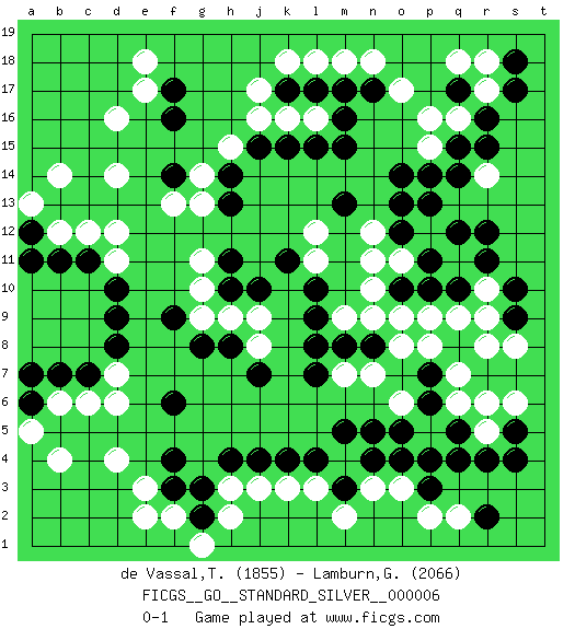 Last move : 0-1 2011 December 29 14:7:30 [Event "FICGS__GO__STANDARD_SILVER__000006"] [Site "FICGS"] [Date "2011.11.09"] [Round "1"] [Black "de Vassal,Thibault"] [White "Lamburn,Graham"] [Result "0-1"] [Rating 1 "1855"] [Rating 2 "2066"] 1.r4 d4 2.q17 d16 3.p3 r14 4.r12 r17 5.r16 q16 6.s17 r18 7.q15 p16 8.r15 p15 9.q14 o17 10.s18 q18 11.o10 j16 12.f17 e17 13.f16 d14 14.f14 d12 15.j15 k16 16.k15 h15 17.l15 l16 18.p14 g13 19.h14 g14 20.h13 f13 21.o14 k3 22.f3 e3 23.f4 d6 24.f6 n3 25.n4 m4 26.n5 o3 27.o4 p2 28.m5 r5 29.q4 r8 30.s9 r9 31.s10 o8 32.n8 p5 33.q5 n7 34.m8 o9 35.p10 q6 36.p6 o6 37.p7 q7 38.o5 p8 39.p4 m7 40.l7 n10 41.l9 m9 42.l10 n12 43.o12 o11 44.p11 n11 45.m15 p12 46.o13 q11 47.q10 r10 48.r11 q9 49.q12 p9 50.p13 s6 51.s5 r6 52.s4 s8 53.l4 l3 54.m3 m2 55.k4 j3 56.j4 h3 57.f9 e18 58.d9 g11 59.h11 g10 60.h10 g9 61.g8 h9 62.h8 j9 63.c11 c12 64.b11 b12 65.c7 c6 66.b7 b6 67.l8 n9 68.m13 q2 69.r2 d7 70.d8 d11 71.d10 f2 72.m16 m18 73.m17 l18 74.l17 k18 75.n17 n18 76.a12 a13 77.a11 b14 78.a6 a5 79.a7 b4 80.g2 e2 81.g3 h2 82.k17 j17 83.h4 g1 84.j10 j8 85.j7 l11 86.k11 l12 0-1 Here are the names of the openings (joseki) played in the four corners : Corner q16 : q17 r14 Komoku (Somok, Xiao~mu`) 3-4 Point. The komoku (3-4) point is the traditional corner enclosure move.. Niken Kakari (Dukan Keolch'im, E`r Gua`jiao~, 2-Space Low Approach). White 2 is used with friendly forces backing it up. Its purpose is to prevent a pincer. Locally it results in a loss, but may be appropriate fuseki strategy. It was popular in the late 1950s and early 1960s, but is not seen often nowadays, having been replaced by the one-space high approach, with which it has points in common. Corner d4 : d4 f3 Hoshi (Hwajeom, Seongjeom, Xingwei`) 4-4 Point. The star or hoshi (4-4) point, emphasizing influence at the potential expense of territory. Ikken Kakari (Hankan Keolch'im, Yi Gua`jiao~, 1-Space Low Approach). Black 2 is the standard approach move to the 4-4. Player White won this Go (weiqi, baduk) game. Follow this game move after move (download)I really believe that Go is destined to take the place of Chess as the leading intellectual game of the Occident, just as it has reigned supreme in the Orient for some four thousand years. (Edward Lasker, international chess master) There is no instance of a country having benefited from prolonged warfare. (Sun Tzu)