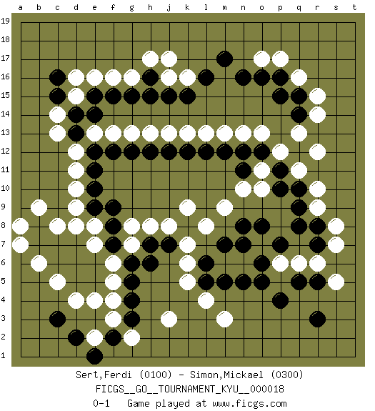 Last move : 0-1 2007 May 26 11:10:7 [Event "FICGS__GO__TOURNAMENT_KYU__000018"] [Site "FICGS"] [Date "2007.01.07"] [Round "1"] [Black "Sert,Ferdi"] [White "Simon,Mickael"] [Result "0-1"] [Rating 1 "0100"] [Rating 2 "0300"] 1.c3 q16 2.r3 d16 3.e15 e16 4.f15 c14 5.d14 c13 6.d13 d12 7.e12 d11 8.e11 d10 9.e10 d9 10.e9 e8 11.f8 e7 12.f7 f6 13.g6 g7 14.h7 g8 15.f9 h8 16.e6 f5 17.h6 j8 18.g5 f4 19.g4 f3 20.g3 d6 21.e5 d4 22.p15 o17 23.n16 r15 24.q15 r14 25.q14 q13 26.p16 p17 27.o16 r10 28.d7 d8 29.d5 c5 30.c6 e4 31.d6 b6 32.c7 c8 33.b7 a7 34.b8 b9 35.c15 d15 36.c16 f16 37.g15 g16 38.h15 j16 39.h16 h17 40.j15 k16 41.k15 r6 42.p4 l8 43.l16 e13 44.e14 f13 45.f12 g13 46.g12 h13 47.h12 j13 48.j12 k13 49.k12 l13 50.l12 m13 51.m12 n13 52.n12 o13 53.o12 p12 54.p11 q11 55.p10 p6 56.q10 r12 57.j7 k7 58.q9 r9 59.q8 l4 60.r8 s8 61.q5 q6 62.r7 s7 63.o6 o7 64.n7 n6 65.o5 m6 66.l6 k6 67.n8 o11 68.p7 n10 69.l5 k5 70.m5 m3 71.n5 j3 72.m7 m9 73.r5 s5 74.m17 j17 75.f2 e2 76.n11 o10 77.o8 k9 78.e1 g2 79.d2 a8 0-1 This go game has been lost on time (started : 2007.01.07 22:37:56) Here are the names of the openings (joseki) played in the four corners : Corner d16 : d16 e15 Hoshi (Hwajeom, Seongjeom, Xingwei`) 4-4 Point. The star or hoshi (4-4) point, emphasizing influence at the potential expense of territory. Corner d4 : c3 d9 San-San (Sam-Sam, San-San) 3-3 Point. The San-San (3-3) point, emphasizing territory at the expense of influence. Corner q16 : q16 p15 Hoshi (Hwajeom, Seongjeom, Xingwei`) 4-4 Point. The star or hoshi (4-4) point, emphasizing influence at the potential expense of territory. Corner q4 : r3 r6 San-San (Sam-Sam, San-San) 3-3 Point. The San-San (3-3) point, emphasizing territory at the expense of influence. Nikken Kakari (Dukan Keolch'im, E`r Gua`jiao~, 2-Space Low Approach). Black can thwart White's strategy with a play at 9-4. Player White won this Go (weiqi, baduk) game. Follow this game move after move (download)Attach to the strongest stone in a pincer. (Anonymous) All men can see these tactics whereby I conquer, but what none can see is the strategy out of which victory is evolved. (Sun Tzu)